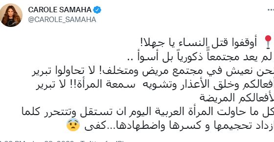 وغردت كارول سماحة على موقع التدوينات القصيرة “تويتر” قائلة:" أوقفوا قتل النساء يا جهلا! لم يعد مجتمعاًً ذكورياً بل أسوأ .. نحن نعيش في مجتمع مريض ومتخلف! لا تحاولوا تبرير أفعالكم وخلق الأعذار وتشويه سمعة المرأة!! لا تبرير لأفعالكم المريضة كل ما حاولت المرأة العربية اليوم ان تستقل وتتتحرر كلما ازداد تحجيمها و كسرها واضطهادها…كفى".