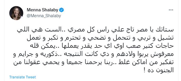 قالت منة شلبي على موقع التدوينات القصيرة"تويتر" مغردة قائلة “ستاتك يا مصر تاج على رأس كل مصرى الست هي اللي تشيل و تربي و تتحمل و تضحي و تحترم وتكبر وتعمل حاجات كتير صعب اوي اي حد يقدر يعملها يمكن قله معرفوش يربوا ولادهم و دي كانت النتيجة ذكورية و جرائم و تفكير من اماكن غلط ربنا يرحمنا جميعا و يحمي عقولنا من الجنون ده”.