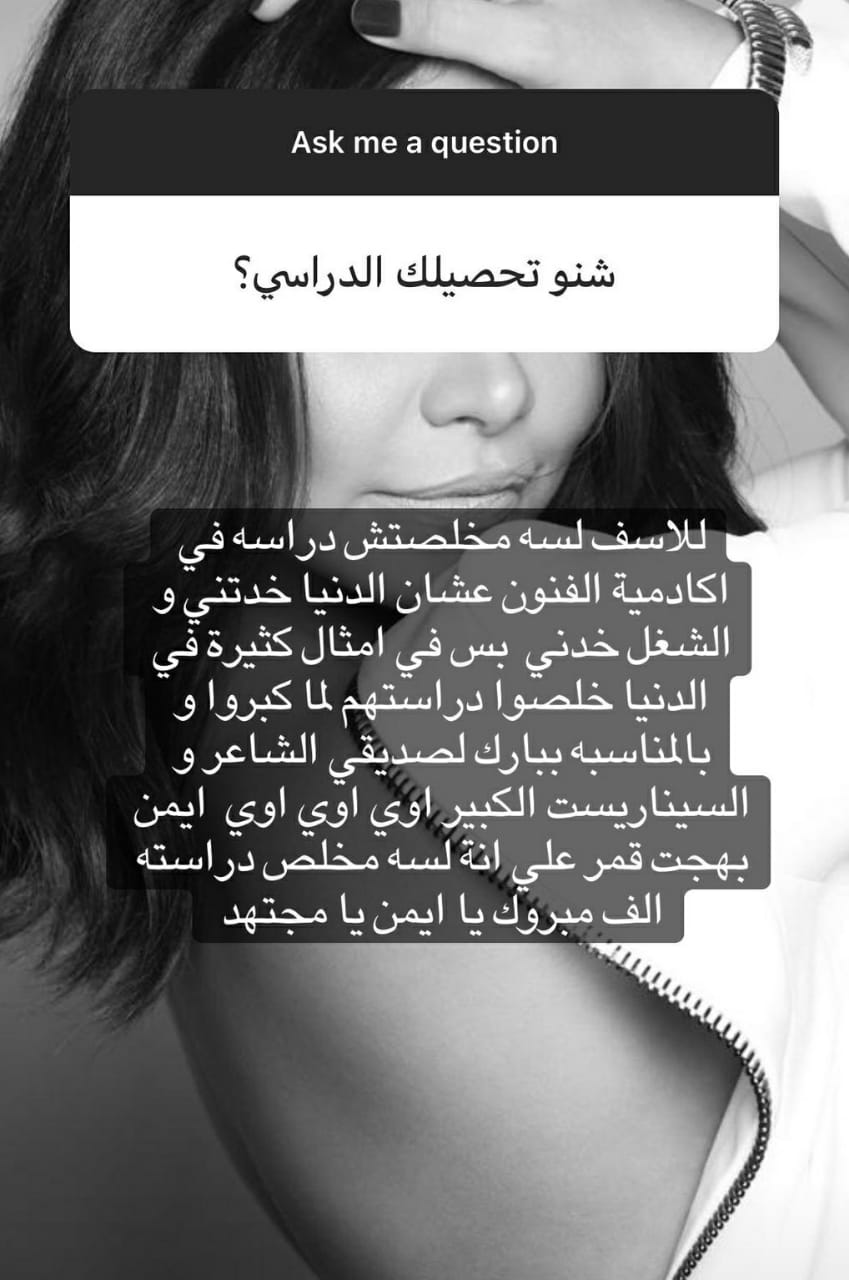 ردت شيرين عبد الوهاب قائلة" للأسف لسه مخلصتش دراسة في أكاديمية الفنون، عشان الدنيا خدتني والشغل خدني، وبهذا المناسبة أوجه التهنئة للشاعر أيمن بهجت قمر الذي انتهى مؤخرا من دراسته الجامعية بعد فترة انقطاع طويلة".