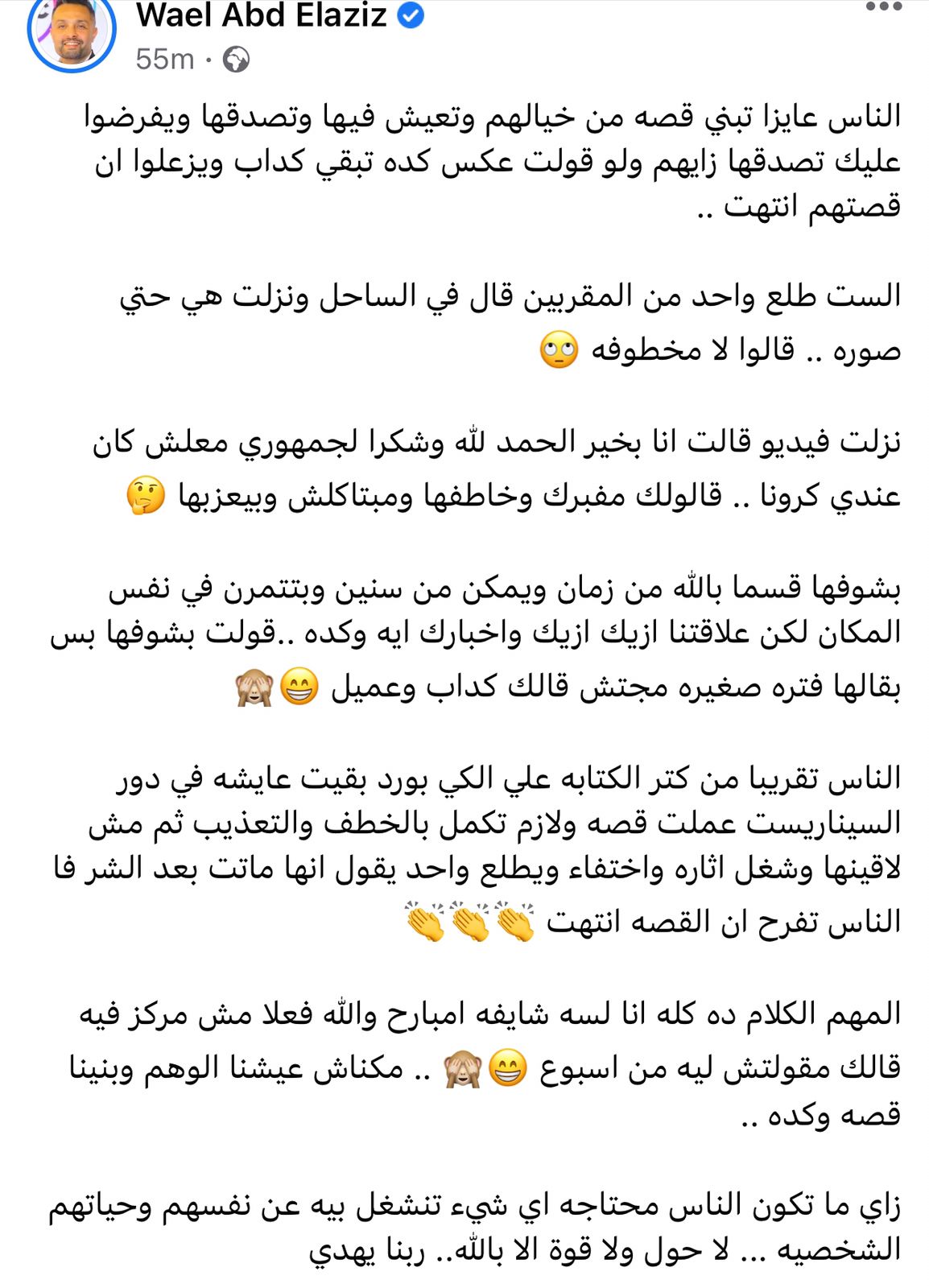 اختتم كلامه:" المهم الكلام ده كله انا لسه شايفه امبارح والله فعلا مش مركز فيه قالك مقولتش ليه من اسبوع .. مكناش عيشنا الوهم وبنينا قصه وكده ؛ زي ما تكون الناس محتاجه اي شيء تنشغل بيه عن نفسهم وحياتهم الشخصيه ... لا حول ولا قوة الا بالله.. ربنا يهدي".