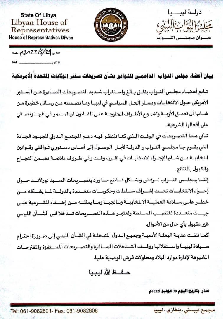 ورأى النواب أن "ما تضمنته تصريحات السفير الأمريكي رسـائل خطيرة مـن شـأنها أن تعمـق الأزمـة وتشجع الأطراف الخارجـة علـى القـانـون أن تستمر في غيها وتضفي على أفعالها الشرعية"، في إشارة لحكومة عبدالحميد الدبيبة منتهية الولاية.