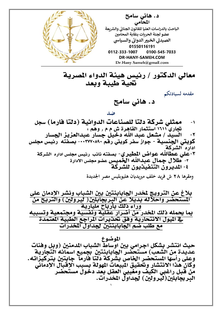 وطالب البلاغ بضم مستحضر الجابابنتين الى جداول المخدرات كما تم لبديله البريجابلين , حتى يتم ضمان صرفه للمرضى الحقيقيين فقط. وطالب كذلك بالتحقيق في تربح الشركة الأجنبية من وراء الإتجار في ذلك المستحضر واستهداف الشباب ونشر الإدمان وتدمير عقول الشباب.