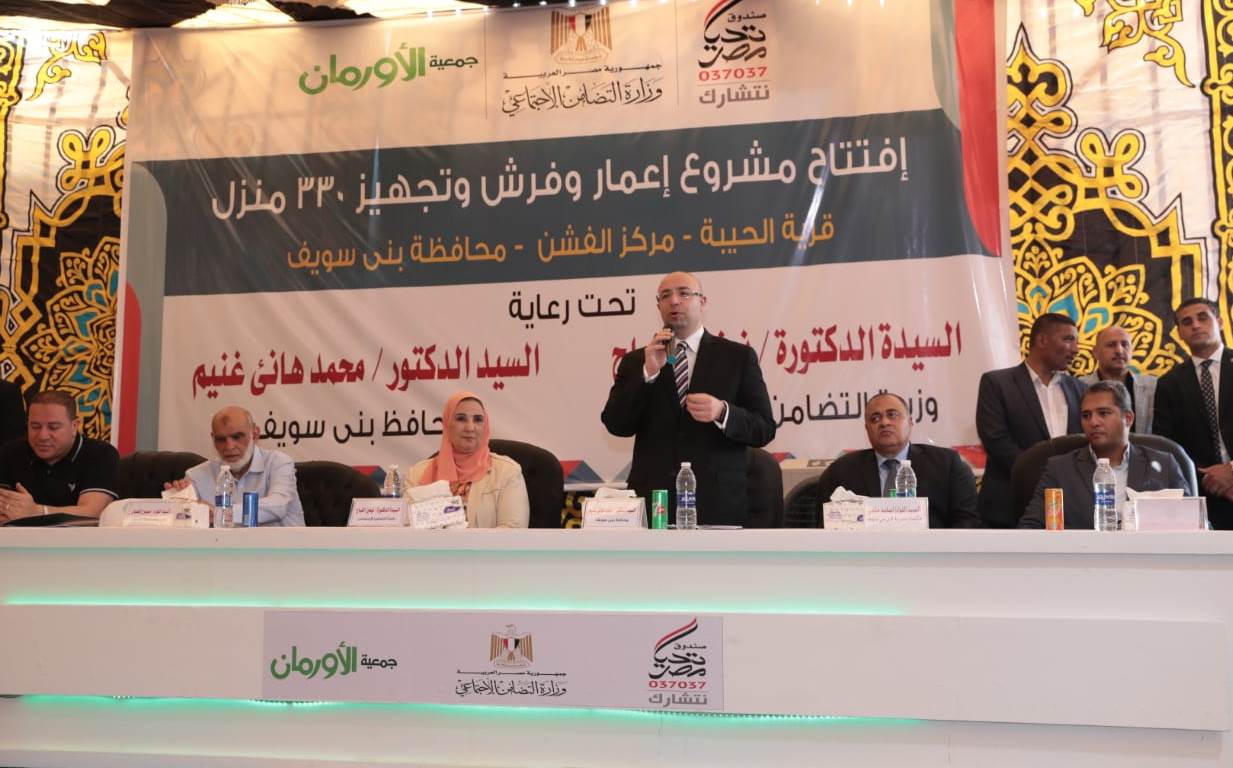 وزيرة التضامن ومحافظ بني سويف يفتتحان مشروع تأهيل وإعادة بناء 330 منزلاً بالحيبة