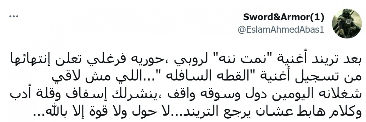 وهاجم أحد رواد مواقع التواصل الاجتماعي على ”تويتر“ اسم الأغنية، قائلا :"بعد تريند أغنية نمت ننه، لروبي، حورية فرغلي تعلن الانتهاء من تسجيل أغنية القطة السافلة، اللي مش لاقي شغلانة اليومين دول وسوقه واقف، ينشر لك إسفافا وقلة أدب وكلاما هابطا، عشان يرجع التريند".