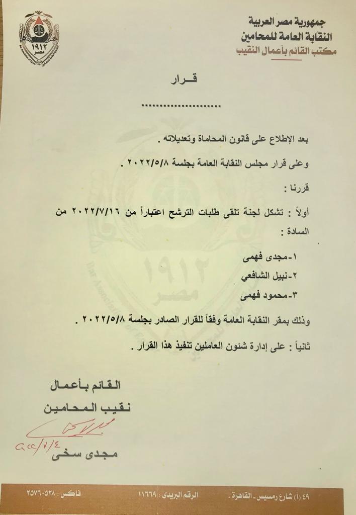 بعد الاطلاع على قانون المحاماة وتعديلاته، وعلى قرار مجلس النقابة العامة بجلسة 8/5/2022 قررنا: