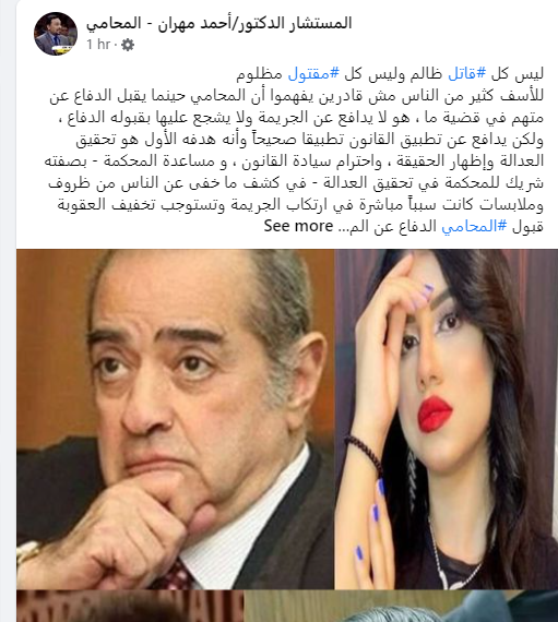وقال المحامى أحمد مهران عبر صفحته الرسمية بموقع “فيس بوك”، ليس كل قاتل ظالم وليس كل مقتول مظلوم للأسف كثير من الناس مش قادرين يفهموا أن المحامي حينما يقبل الدفاع عن متهم في قضية ما ، هو لا يدافع عن الجريمة ولا يشجع عليها بقبوله الدفاع ، ولكن يدافع عن تطبيق القانون تطبيقا صحيحاً وأنه هدفه الأول هو تحقيق العدالة وإظهار الحقيقة ، واحترام سيادة القانون ، و مساعدة المحكمة - بصفته شريك للمحكمة في تحقيق العدالة - في كشف ما خفى عن الناس من ظروف وملابسات كانت سبباً مباشرة في ارتكاب الجريمة وتستوجب تخفيف العقوبة".
