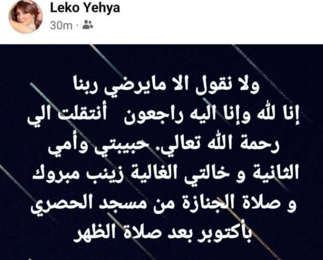 أعلنت الفنانة لقاء سويدان وفاة خالتها عبر حسابها بموقع التواصل الاجتماعي فيسبوك.