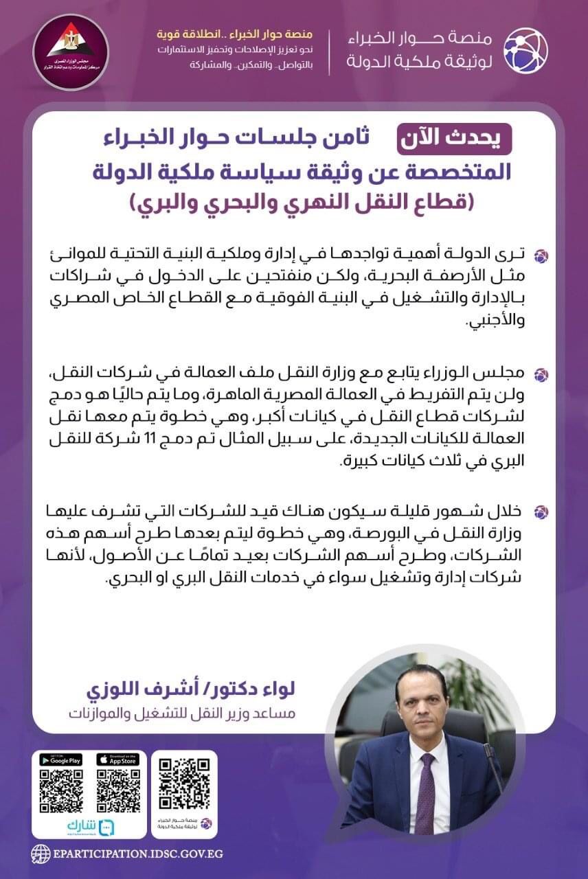 وتابع في ثامن جلسات الحوار المجتمعي حول وثيقة سياسة ملكية الدولة التي نظمها مركز المعلومات ودعم اتخاذ القرار بمجلس الوزراء، أنه خلال شهور قليلة سيكون هناك قيد للشركات التي تشرف عليها وزارة النقل في البورصة وهي خطوة يتم بعدها طرح أسهم الشركات بعيدا تماما عن الأصول، لأنها شركات إدارة وتشغيل.