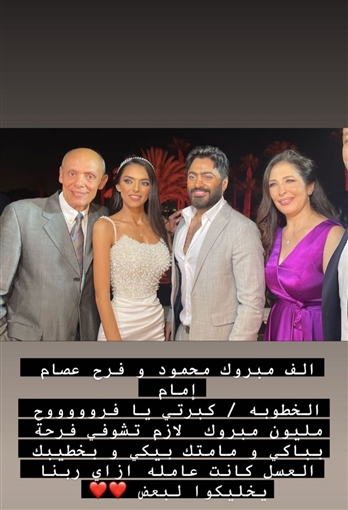 ونشر تامر حسني عبر صفحته الخاصة على موقع تبادل الصور والفيديوهات "إنستجرام" صور له من الخطوبة وعلق عليها قائلا:"ألف مبروك محمود وفرح عصام إمام الخطوبة، كبرتي يا فروحة مليون مبروك، لازم تشوفي فرحة بباكي ومامتك بيكي وبخطيبك العسل كانت عامله إزاي ربنا يخليكوا لبعض".