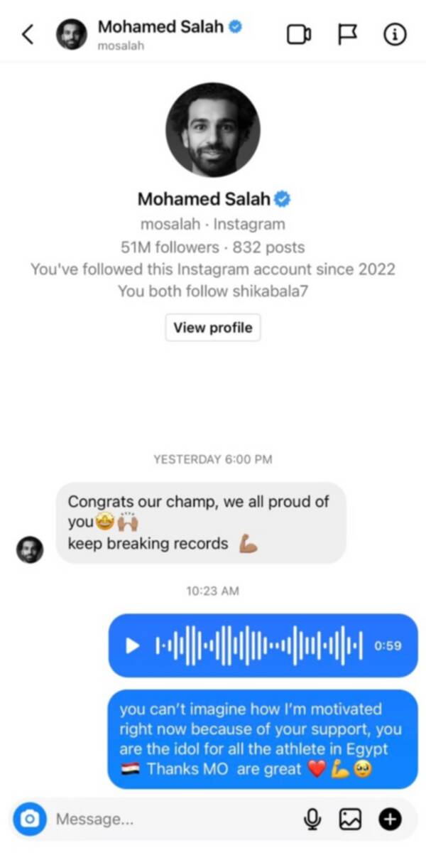 ونشرت بسنت حميدة عبر صفحتها بموقع “فيسبوك” رسالة من محمد صلاح وجهها لها عبر إنستجرام وقال فيها:" مبروك إلى بطلتنا ، نحن جميعا فخورون بك، استمري في تحطيم الأرقام القياسية".