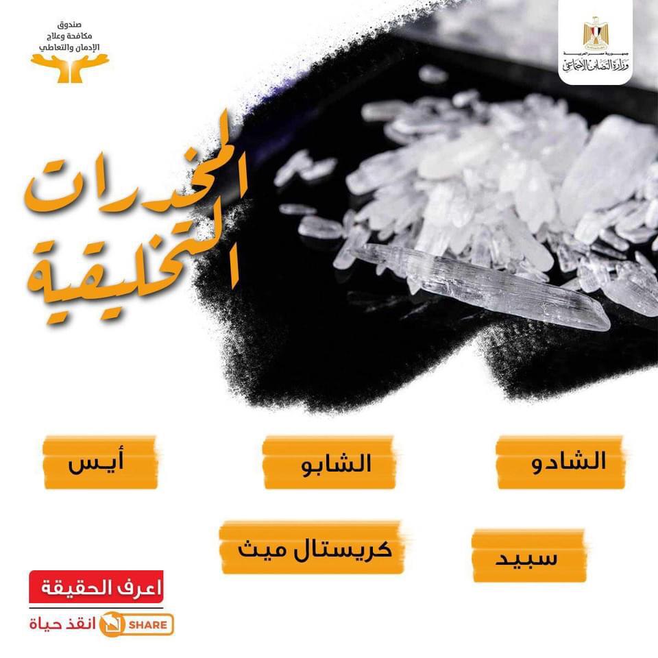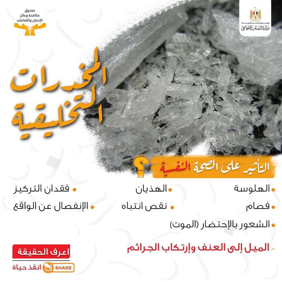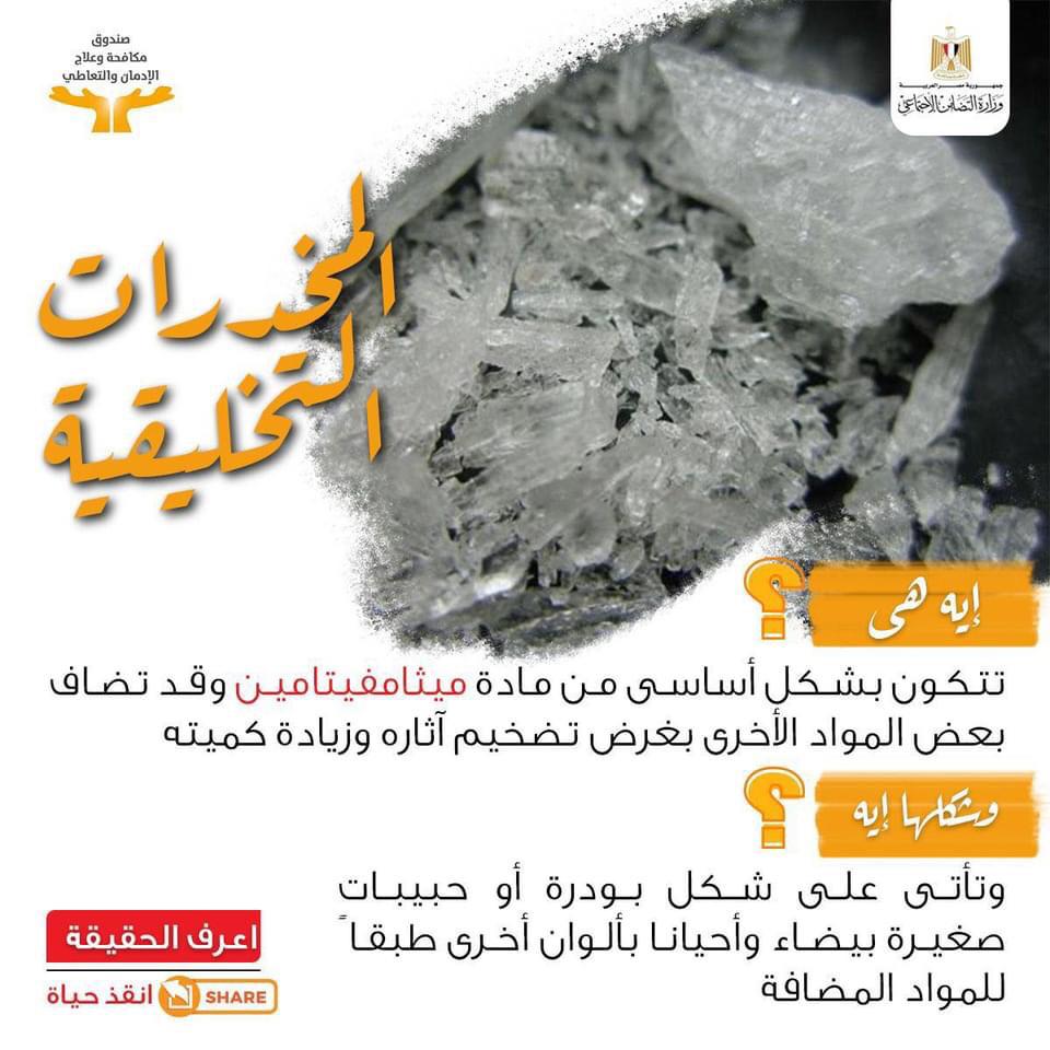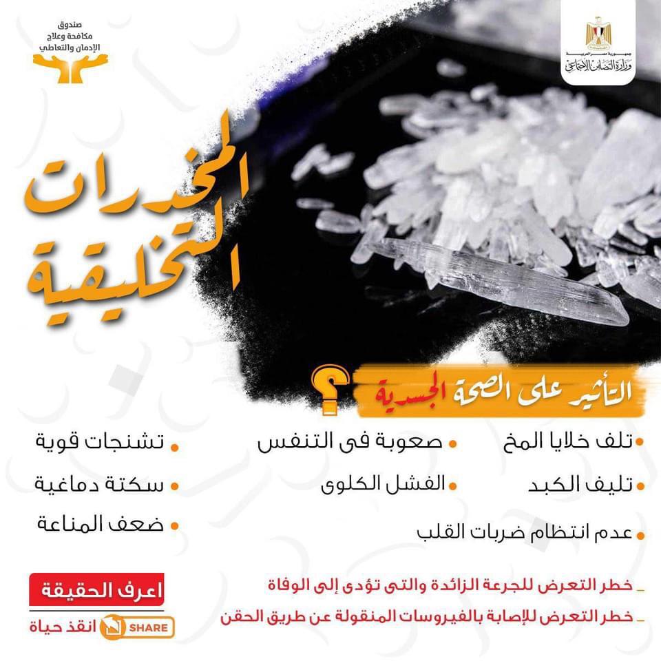 نشرت الصفحة الرسمية لصندوق مكافحة وعلاج الادمان والتعاطى التابع لوزيرة التضامن الاجتماعىُ "فيس بو" انفو جراف عن المخدرات التخليقية وأضرارها على الصحة النفسية وكذلك أضرارها على الصحة الجسدية تحت عنوان "اعرف الحقيقة .. انقذ حياة" .