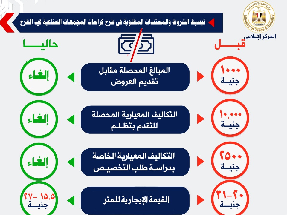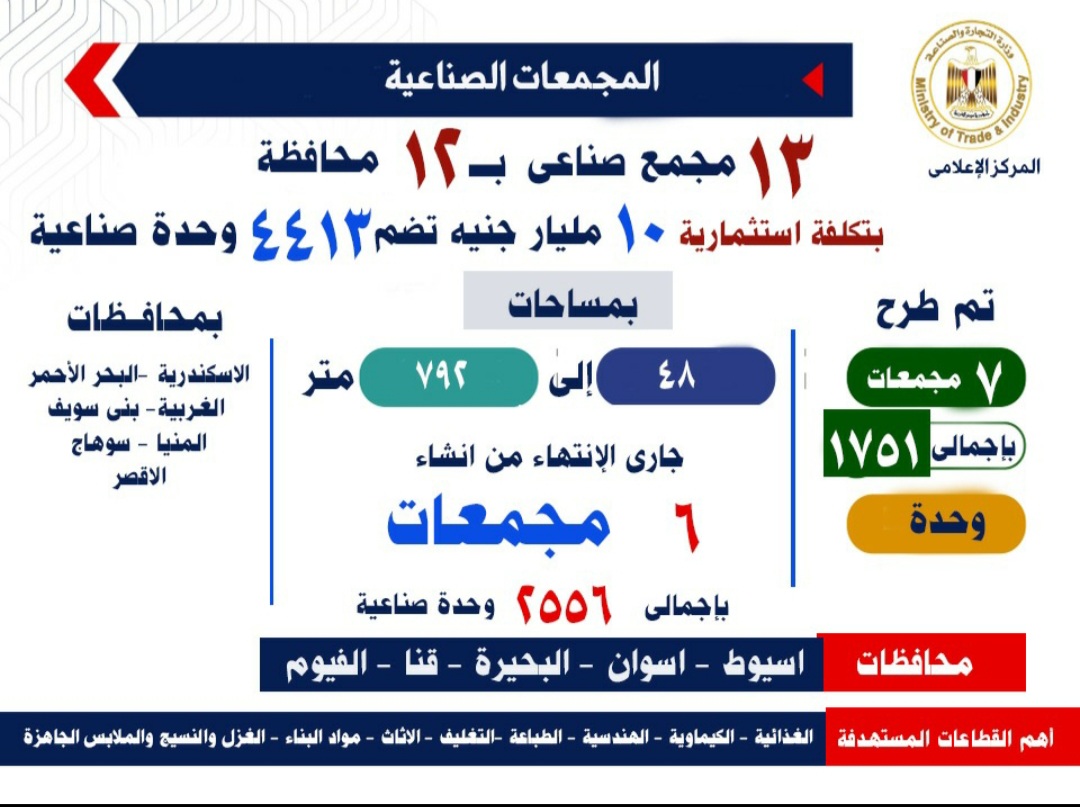 كما استعرضت السيدة/ نيفين جامع، وزيرة التجارة والصناعة خطة الوزارة لانشاء 13 مجمعا صناعيا بـ 12 محافظة، بتكلفة استثمارية تبلغ حوالي 10 مليارات جنيه وتضم 4413 وحدة صناعية، حيث أشارت الى قيام الوزارة خلال شهر أكتوبر من عام 2020 بطرح عدد 7 مجمعات، باجمالى عدد وحدات بلغ 1751 وحدة بمحافظات الإسكندرية، والبحر الأحمر، والغربية، وبني سويف، والمنيا، وسوهاج، والأقصر، وذلك بمساحات تتراوح ما بين 48 م2 الى 792 م2 وفقاً لنوع الأنشطة المستهدفة.