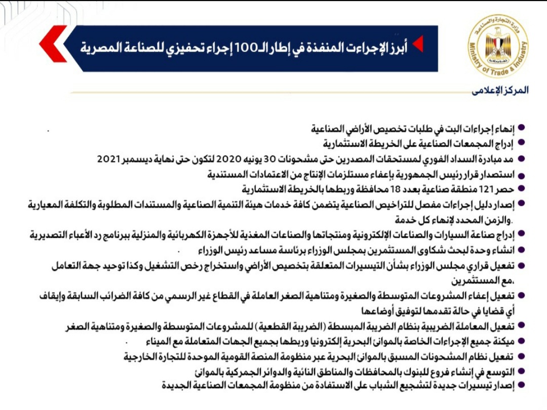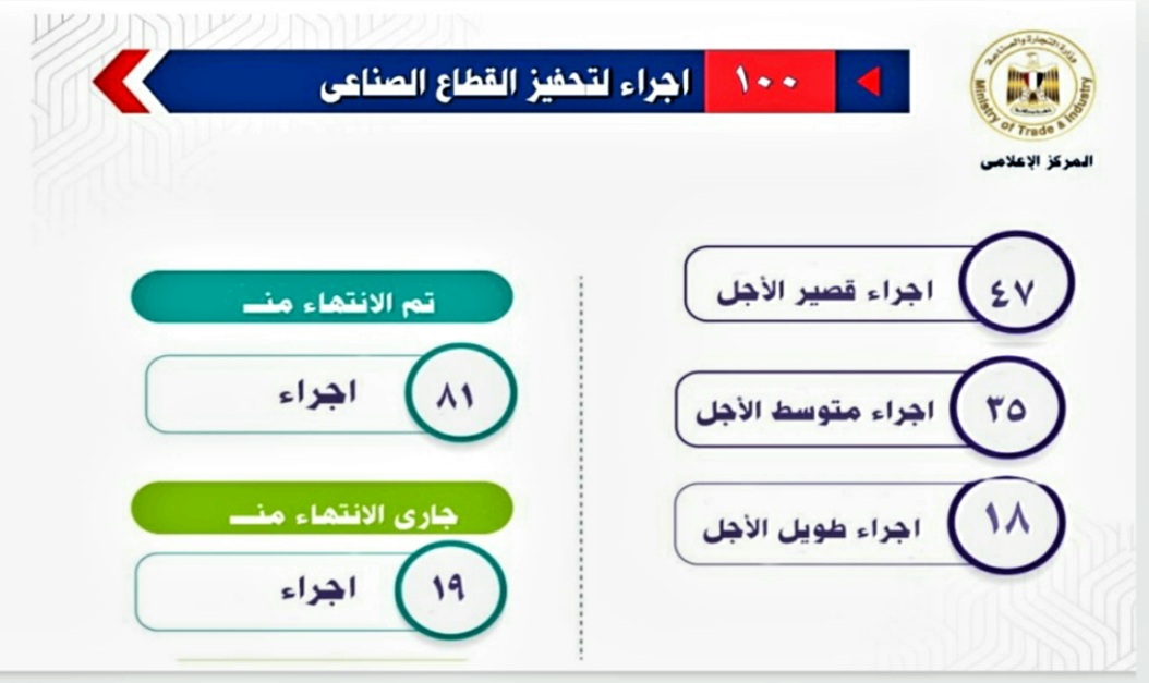 وأوضحت جامع أنه تم إعداد قائمة بـ 100 إجراء لتحفيز الصناعة المصرية، وجذب المستثمرين للاستثمار في القطاعات الصناعية المختلفة شملت 47 إجراء قصير الأجل، و35 إجراء متوسط الأجل، و18 اجراء طويل الأجل، لافتةً إلى أنه تم تنفيذ 81 إجراء من إجمالي الـ 100 إجراء المقترحة، وجار العمل على الانتهاء من الـ19 إجراء المتبقية، كونها إجراءات ذات طابع تشريعي، ومشروعات كبيرة، ومنها الإسراع في عملية ميكنة صندوق تنمية الصادرات، وزيادة نسبة المكون المحلي، واقتراح حزم تشجيعية للصناعات المغذية، بالإضافة إلى صياغة خطة لتطوير المدارس الفنية وزيادة اعدادها، وتحويلها للتخصصات ذات الأولوية وخطط التنمية الصناعية.