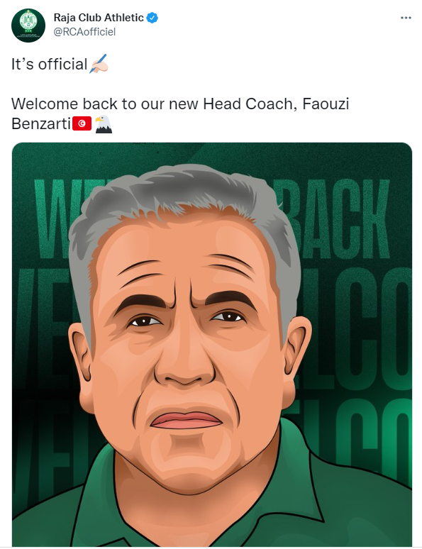 أعلن نادي الرجاء المغربي على صفحته الرسمية على مواقع التواصل الإجتماعي "تويتر" تعيين المدرب التونسي فوزي البنزرتي مدربًا جديدًا للفريق، خلفًا لرشيد الطاوسي.