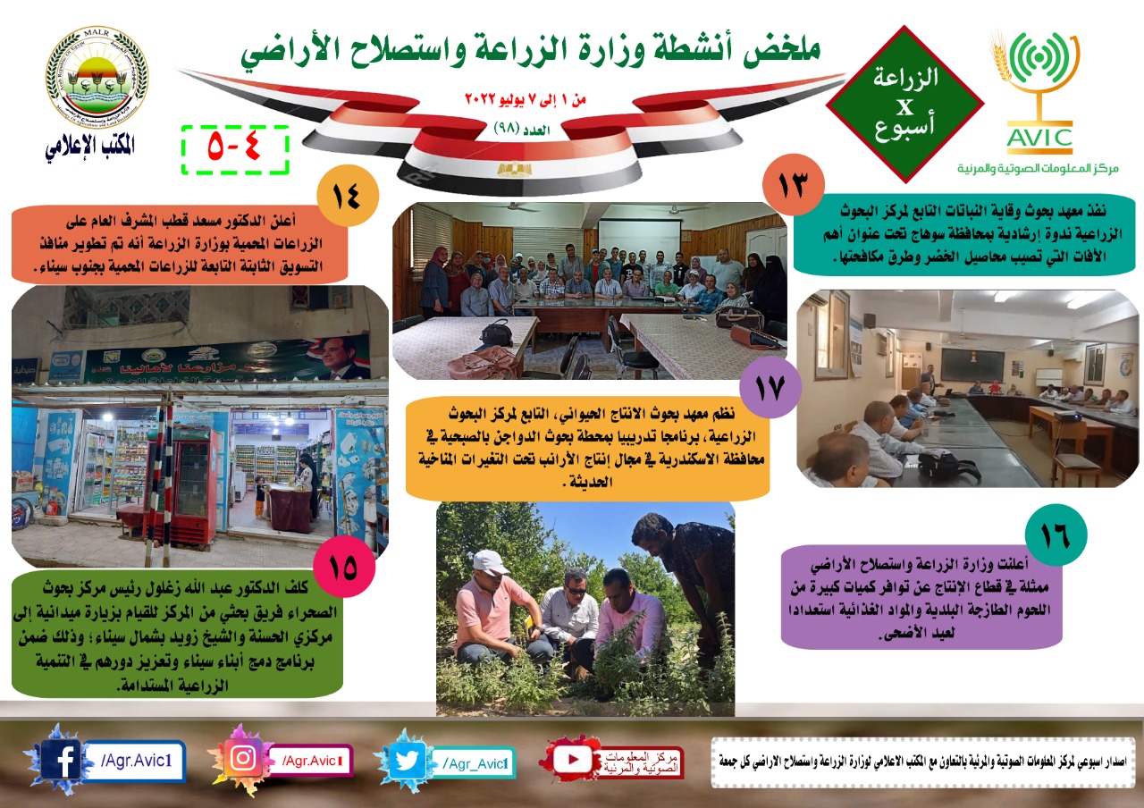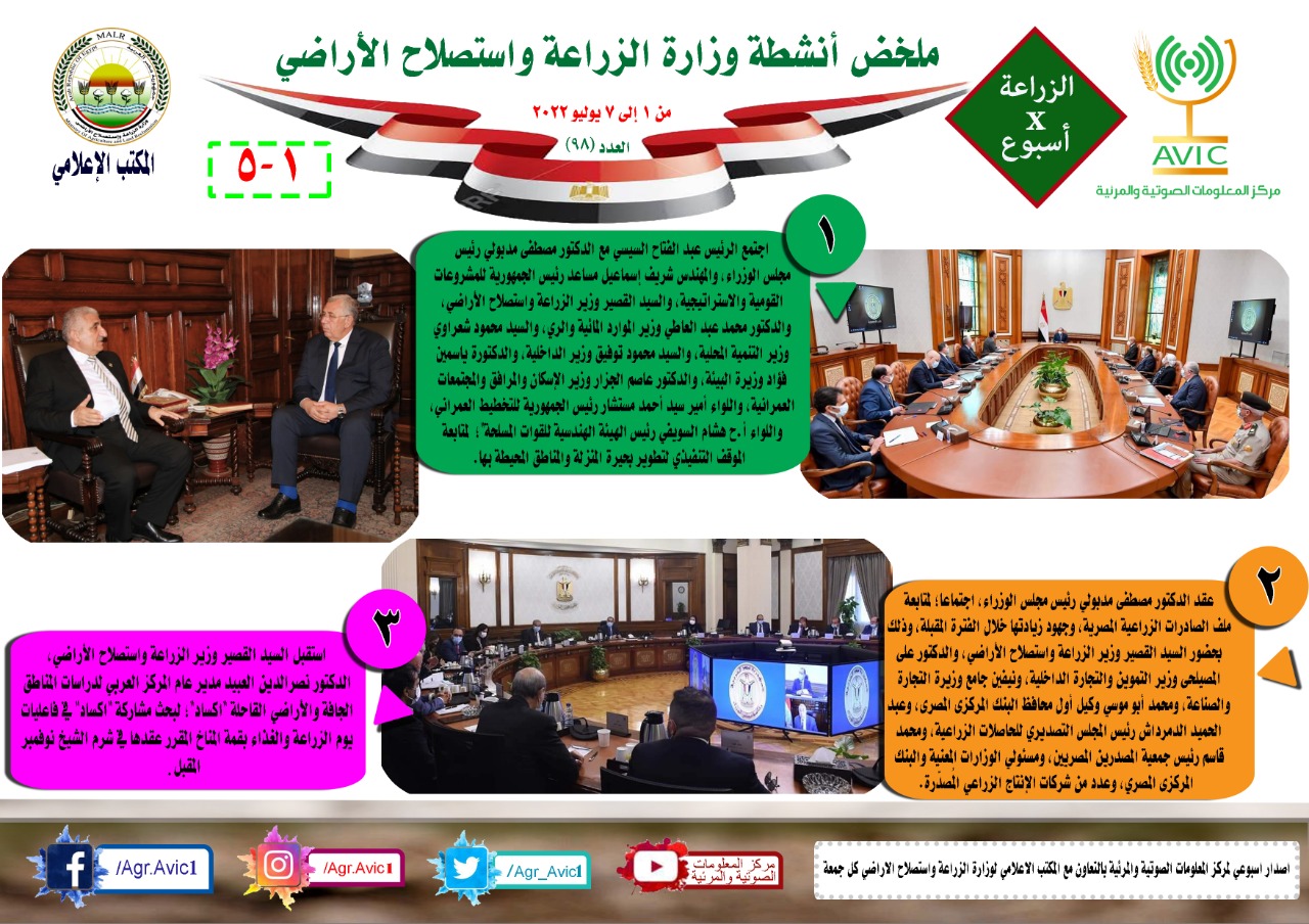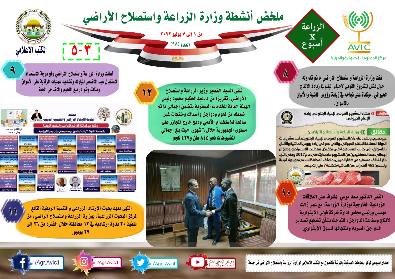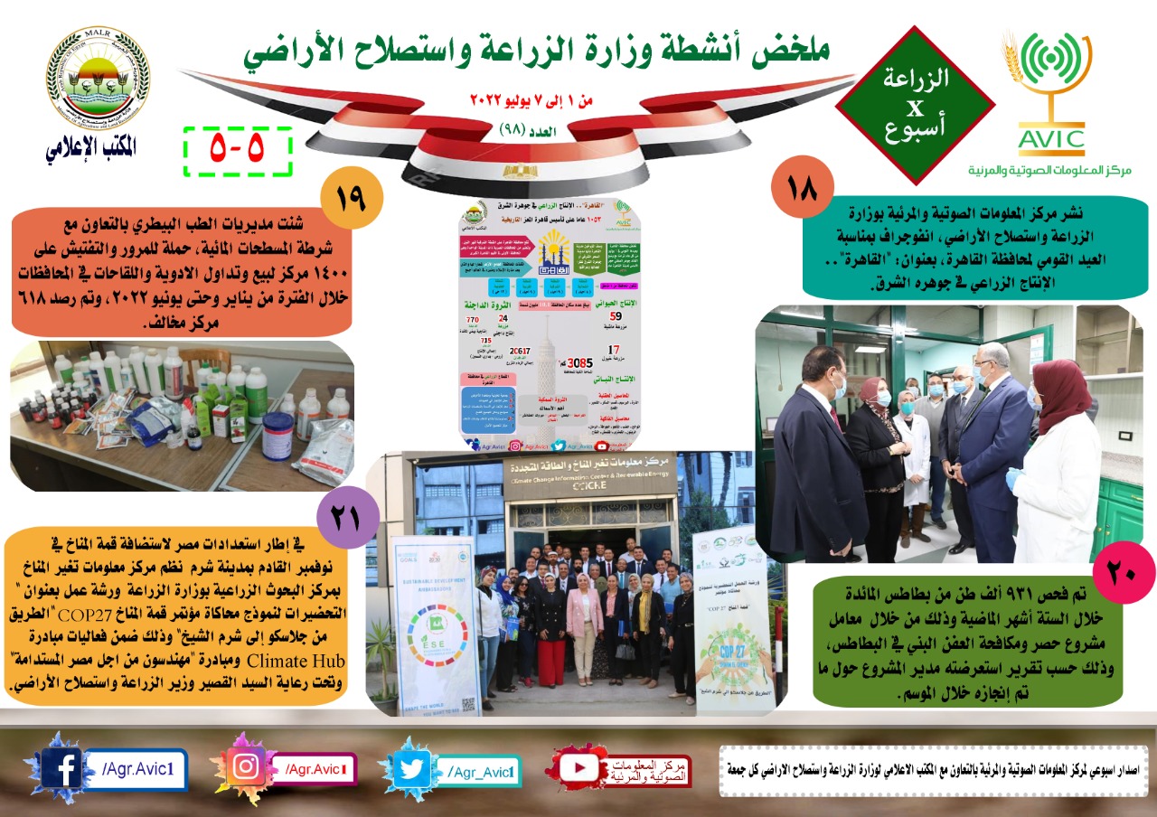أصدر مركز المعلومات الصوتية والمرئية، التابع لوزارة الزراعة واستصلاح الاراضي، "الانفوجراف الاسبوعي" في نسخته رقم 98 حول الحصاد الاسبوعي لأهم أنشطة الوزارة، خلال الاسبوع الماضي في الفترة من 1 وحتى 7 يوليو الجاري، وذلك بالتعاون مع المكتب الاعلامي للوزارة، كما أصدر المركز ايضا ملخصا بالفيديو، حول انشطة الوزارة خلال نفس الفترة.