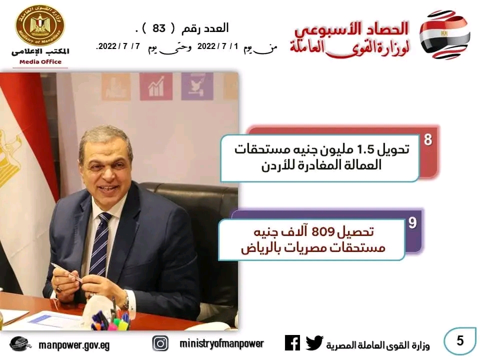 وامتد الحصاد ليشمل نجاح مكتب التمثيل العمالي التابع للوزارة بالسفارة المصرية بعمان-الأردن، بالمتابعة اللحظية والجهود المبذولة والمقابلات مع المسئولين بمؤسسة الضمان الاجتماعي بالأردن، واستكمالا لما تم تحويله سابقا، تم تحويل القائمة الـ 86 من مستحقات الضمان الاجتماعي لنحو 42 عامل مصري لدى المؤسسة غادروا عمان نهائيا.