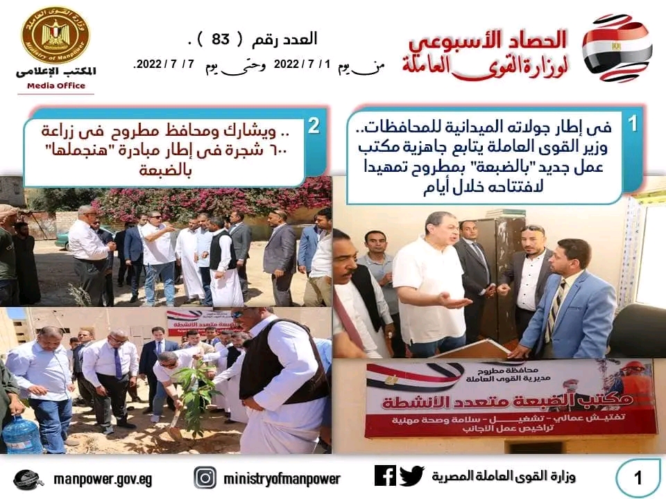شهد حصاد الأسبوع الحالي، في وزارة القوى العاملة العديد من الأحداث المهمة خلال الفترة من 1 إلى 7 يوليو 2022، حيث تابع وزير القوى العاملة جاهزية مكتب عمل جديد "بالضبعة" بمطروح تمهيدا لافتتاحه خلال أيام ، ويشارك ومحافظ مطروح في زراعة 600 شجرة في إطار مبادرة "هنجملها" بالضبعة ، وإجازة عيد الأضحى للقطاع الخاص بأجر كامل من 9الى 14 يوليو الجاري، وتوفير 2752 فرصة عمل برواتب مجزية في 12 محافظة، وندوة حول حقوق وواجبات العمال ومكافحة عمل الأطفال بالإسكندرية ،وتحويل 1.5 مليون جنيه مستحقات العمالة المغادرة للأردن.