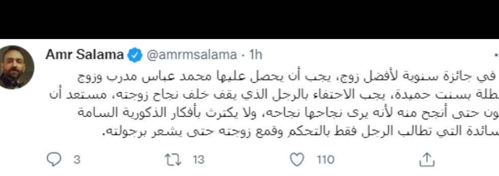 وكتب عمرو سلامة على موقع التدوينات القصيرة "تويتر" مغردا" لو في جائزة سنوية لأفضل زوج، يجب أن يحصل عليها محمد عباس مدرب وزوج البطلة بسنت حميدة، يجب الاحتفاء بالرجل الذي يقف خلف نجاح زوجته مستعد أن تكون حتى أنجح منه لأنه يرى نجاحها نجاحه، ولا يكترث بأفكار الذكورية السامة السائدة التي تطالب الرجل فقط بالتحكم وقمع زوجته حتى يشعر برجولته".