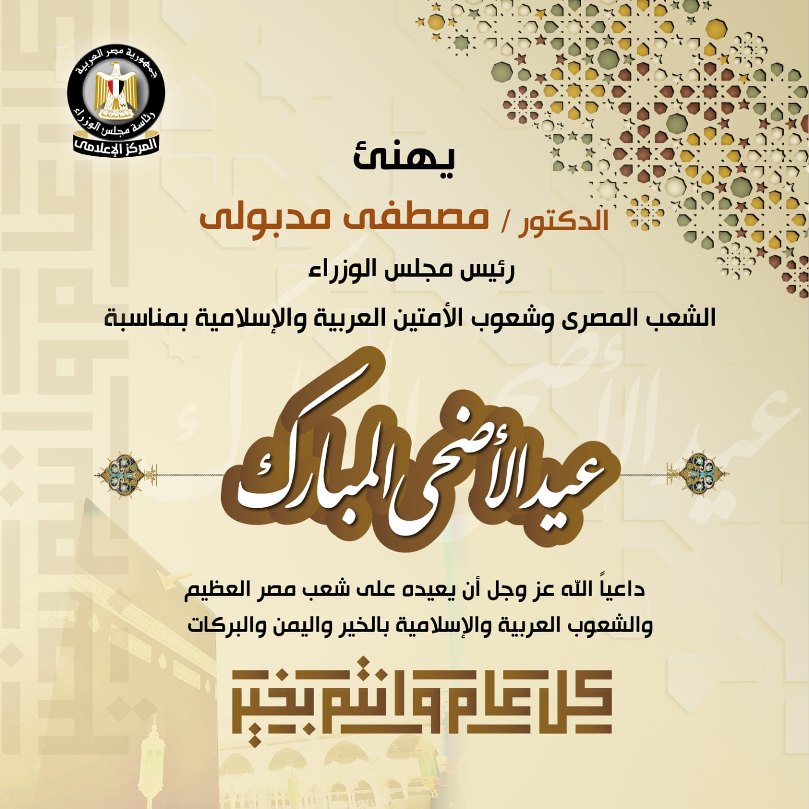 هنأ الدكتور مصطفي مدبولي ، رئيس الوزراء الشعب المصري والأمة الإسلامية والعربية بمناسبة عيد الأضحي المبارك.