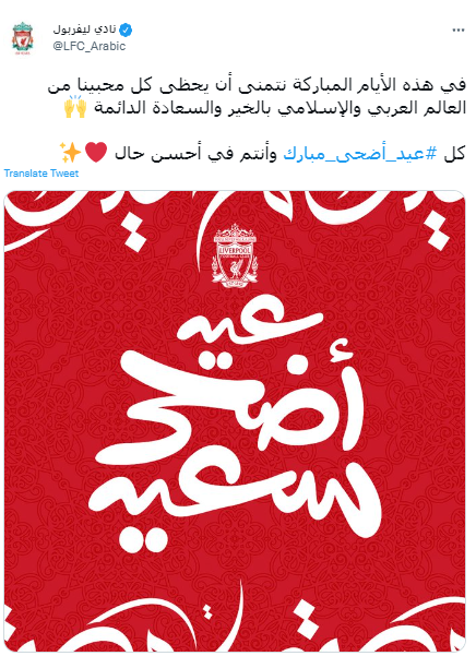 ونشر فريق ليفربول الإنجليزي عبر حسابه على "تويتر"، في هذه الأيام المباركة نتمني أن يحظي كل محبينا من العالم العربي والإسلامي بالخير والسعادة الدائمة، كل عيد أضحي مبارك وأنتم في أحسن حال.