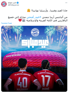 ونشر فريق بايرن ميونيخ الألماني يهنئ الأمة الإسلامية عبر تويتر، "جانا العيد وغنينا وأرسلنا تهانينا" من أليانز أرينا نتمني عيد أضحي مبارك إلي جميع البافاريين في الأمة العربية والأسلامية.