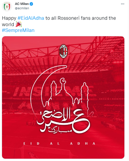ونشر فريق إي سي ميلان عبر صفحته باللغة الإنجليزية على " تويتر" عيد أضحي سعيد لكل عشاق الريسونيري في كل مكان في العالم أجمع.