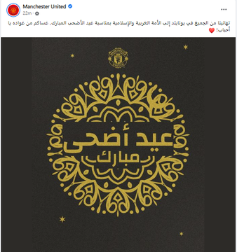 وكذلك نشر فريق مانشستر يونايتد عبر صفحته الرسمية باللغة الإنجليزية على تويتر، "تهانينا من الجميع في يونايتد إلي الأمة العربية والإسلامية بمناسبة عيد الأضحي المبارك، عساكم من عواده يا أحباب.
