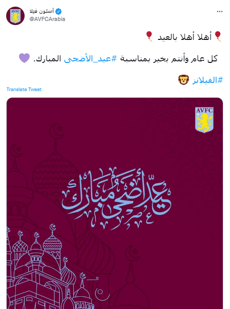 بينما نشر فريق أستون فيلا قائلًا: " أهلًا أهلًا بالعيد" كل عام وأنتم بخير بمناسبة حلول عيد الأضحي المبارك.