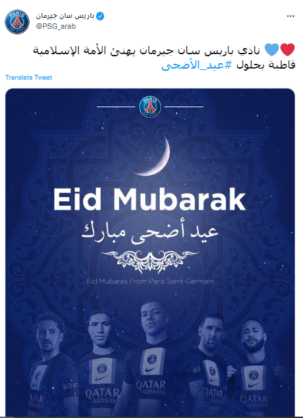 وهنأ فريق باريس سان جيرمان الفرنسي الأمة الإسلامية قائلًا: على صفحته باللغة العربية عبر تويتر نادي باريس سان جيرمان الفرنسي يهنئ الأمة الإسلامية قاطبة بحلول عيد الأضحي المبارك.