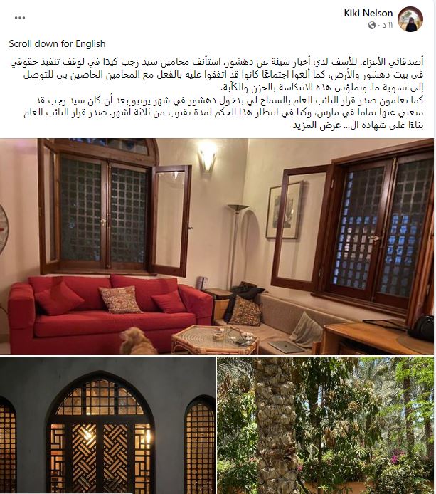 وقالت عبر صفحتها الشخصية علي موقع التواصل الاجتماعي "فيس بوك"،" أصدقائي الأعزاء، للأسف لدي أخبار سيئة عن دهشور. استأنف محامين سيد رجب كيدًا في لوقف تنفيذ حقوقي في بيت دهشور والأرض، كما ألغوا اجتماعًا كانوا قد اتفقوا عليه بالفعل مع المحامين الخاصين بي للتوصل إلى تسوية ما. وتملؤني هذه الانتكاسة بالحزن والكآبة.