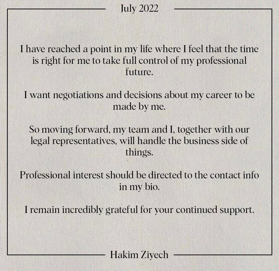 نشر حكيم زياش لاعب فريق تشيلسي الإنجليزي والمنتخب المغربي، بيان عبر حسابه الشخصي على "إنستجرام"، يؤكد إنه هو من سيتولي مسئولية إدارة مستقبله