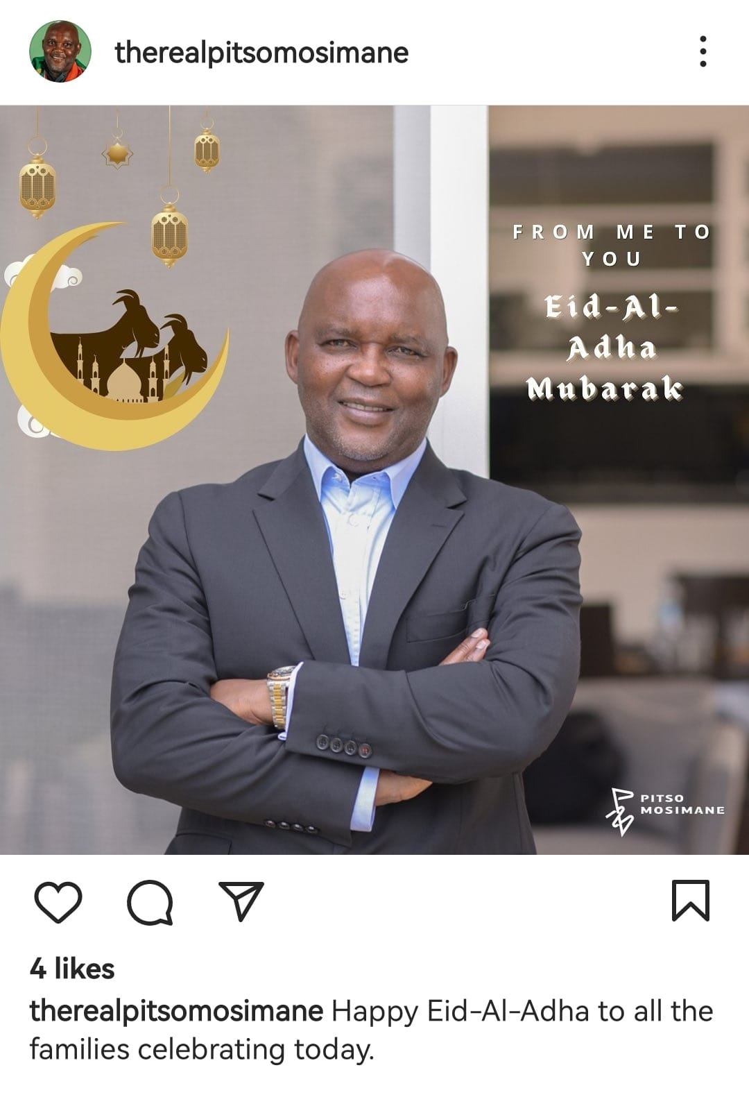 وجه الجنوب أفريقي بيتسو موسيماني المدير الفني السابق للنادي الأهلي، رسالة تهنئة لمتابعيه عبر حسابه الشخصي على انستجرام، بعيد الأضحى المبارك، ونشر موسيماني صورة له وعلق: "عيد أضحى سعيد لكل العائلات التي تحتفل اليوم" .