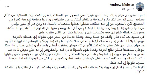 وتابع عن فيلم بحبك للنجم تامر حسني ،" في الفيلم علي (تامر) بيقابل حبيبة (هنا الزاهد) وفي أول لقاء بيسخر منها بكل الطرق الممكنة وغير الممكنة، ومع ذلك -طبعًا- بتقع في حبه وبتضحك هي وأصحابها كمان من اللي بيقوله عليها!في مشهد بعد كده علي واقف مع حبيبة وبيبدأ وصلة جديدة من التنمر فهي بتقوله إنها هتديله بالجزمة فبيقولها يلا أنا موافق (حاجه تضحك أوي) فبتوطي فعلا عشان تقلع الجزمة، وبتكون لابسة جزمة ليها كذا أبزيم ويا حرام عشان هي بنت مش عارفه تفك الأبزيم بتاع جزمتها وبتقوله أصلي رابطاه أوي فعلي عشان راجل جدًا بيوطي يساعدها عشان تقلع الجزمة وفجأة يقوم بايسها! عادي كده، والمفروض إن ده مش تحرش لا ده حب".