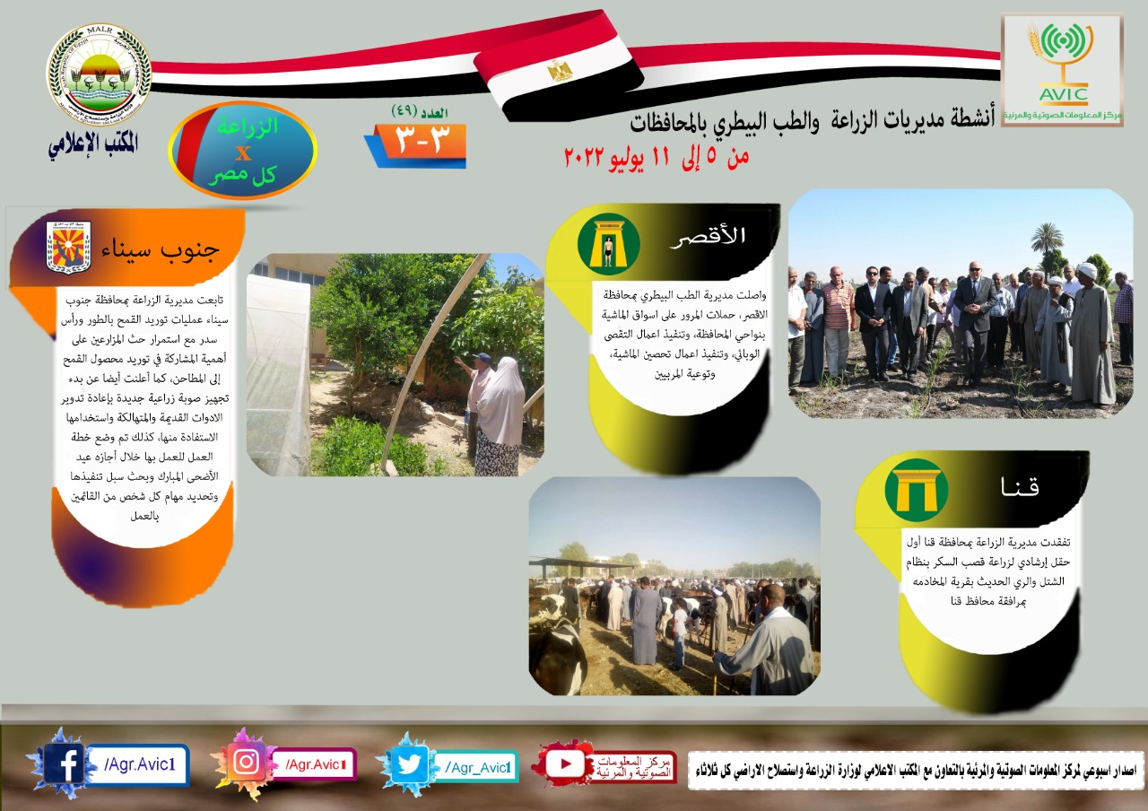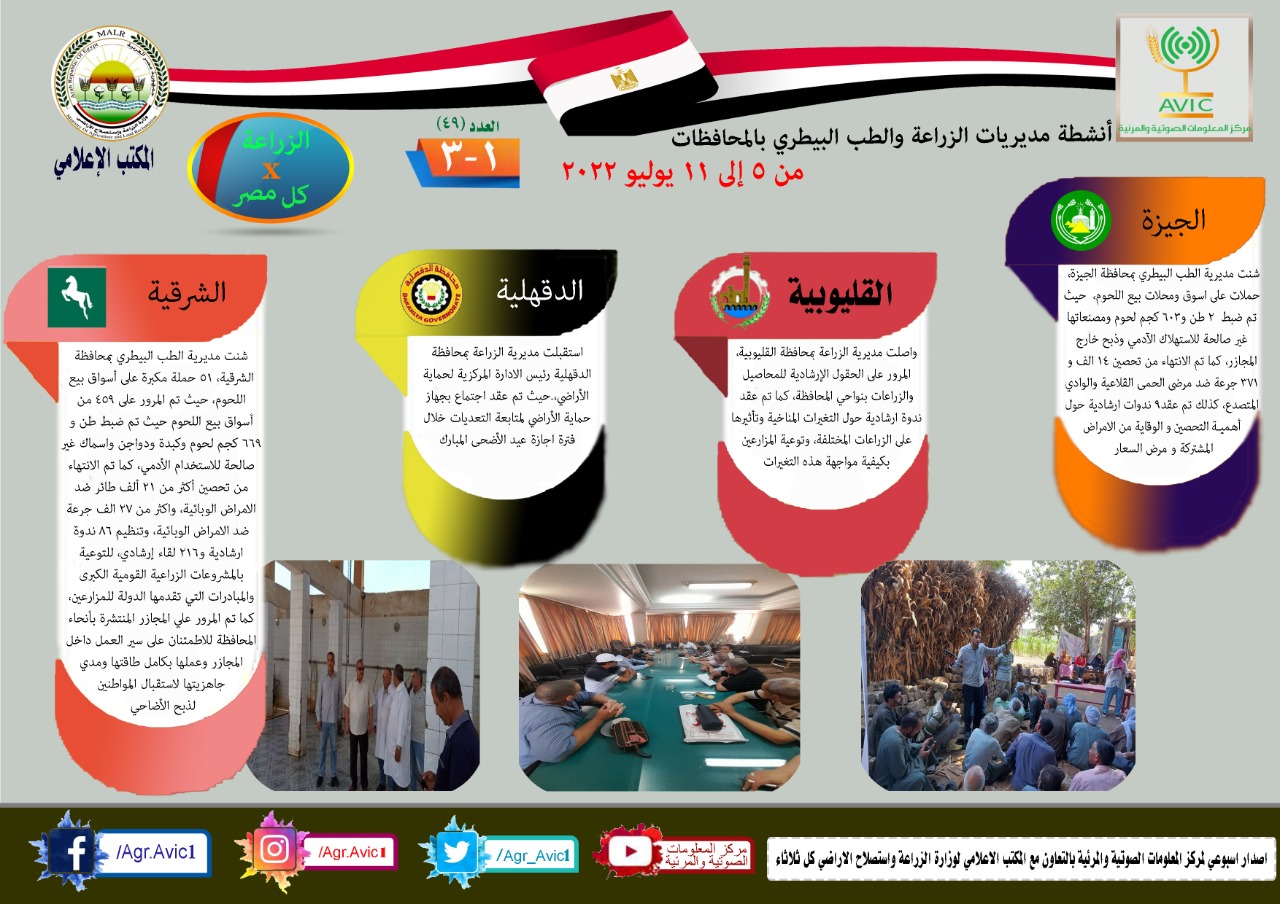 أصدر مركز المعلومات الصوتية والمرئية التابع لوزارة الزراعة واستصلاح الأراضي، والمكتب الاعلامي للوزارة، العدد رقم ٤٩ من اصدار: "الزراعة في كل مصر" بالانفوجراف والفيديو، يوضح الجهود والانشطة التي تقوم بها مديريات الزراعة والطب البيطري بمحافظات الجمهورية خلال الفترة من ٥ إلى ١١ يوليو الجاري.