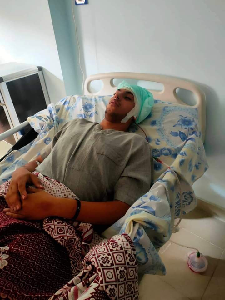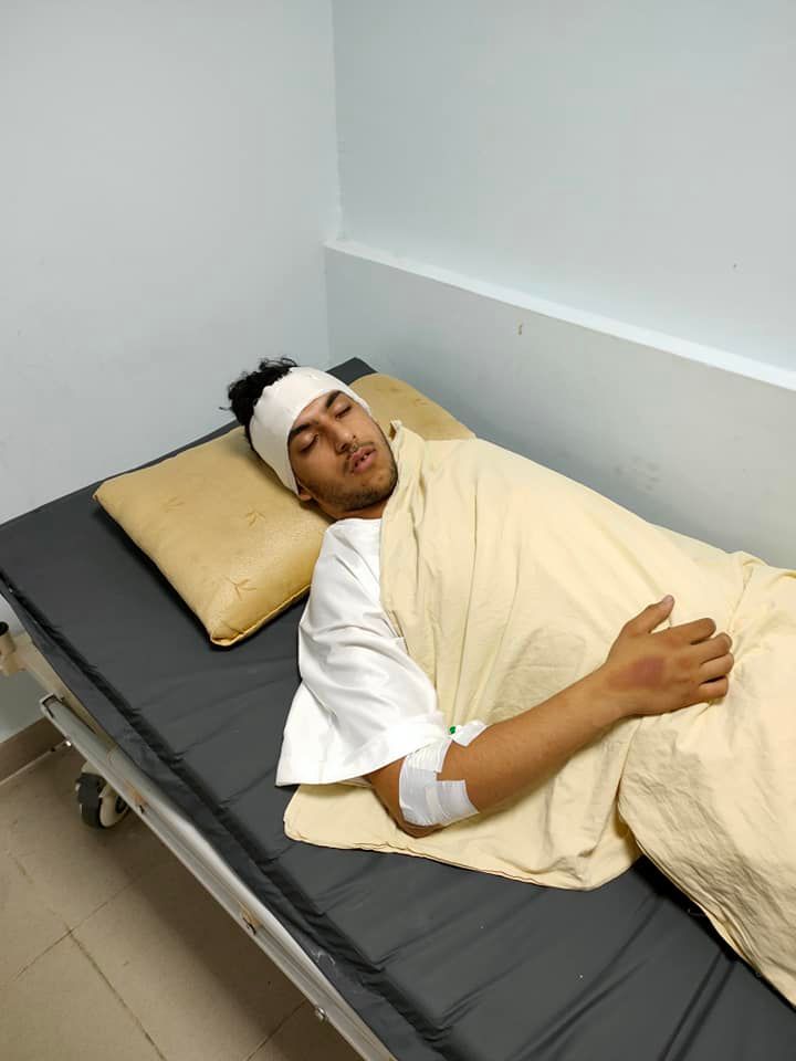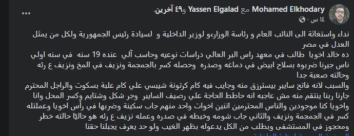 وكتب "محمد" : "ده خالد أخويا طالب في معهد رأس البر العالي دراسات نوعيه وحاسب آلي عنده 19 سنة في سنه أولي ناس جيرنا ضربوه بسلاح ابيض في دماغه وصدره وحصله كسر بالجمجمة ونزيف في المخ ونزيف علي الرئه وحالته صعبة جدًا ".
