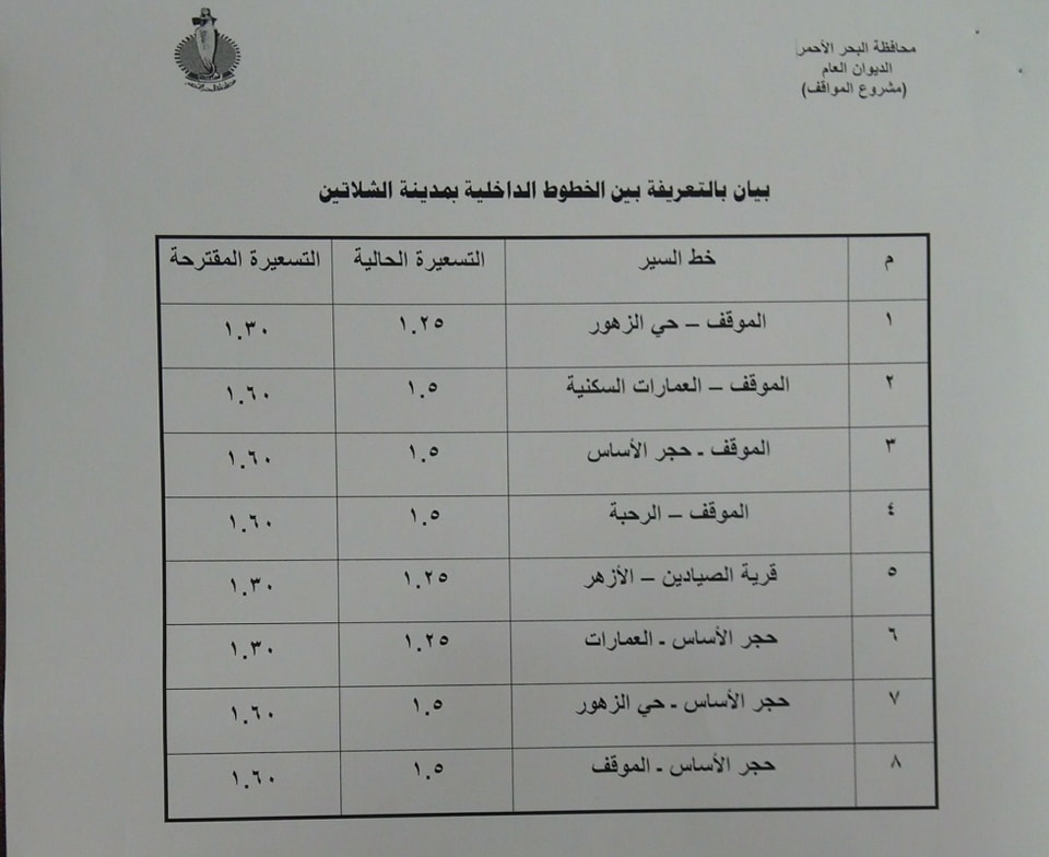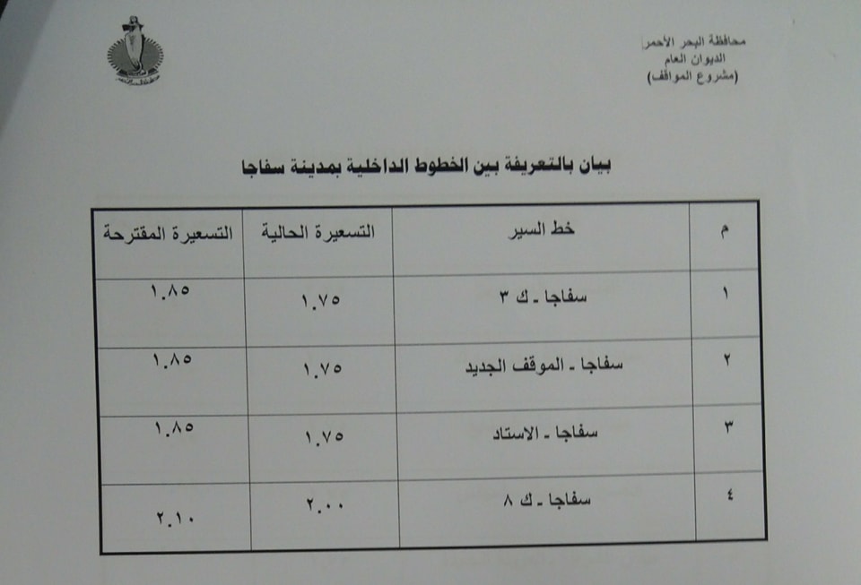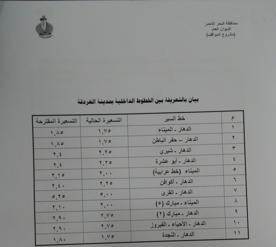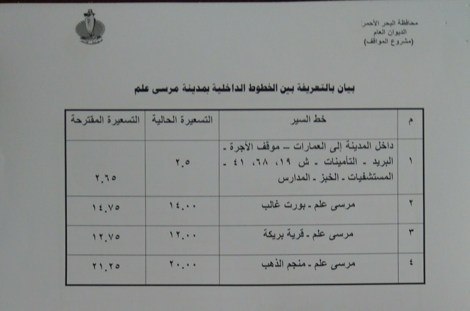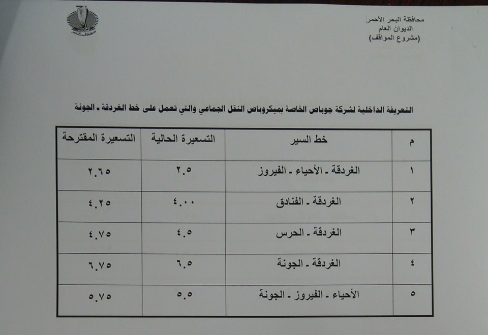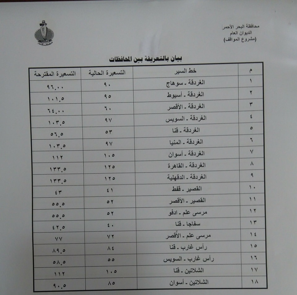 اعتمد اللواء عمرو حنفي محافظ البحر الأحمر ، صباح اليوم ، التعريفة الجديدة للخطوط الداخلية والخارجية بزيادة تتراوح ما بين 5%- 7% وفق تعليمات رئاسة مجلس الوزراء في هذا الشأن بعد الإعلان عن تحريك أسعار المنتجات البترولية.