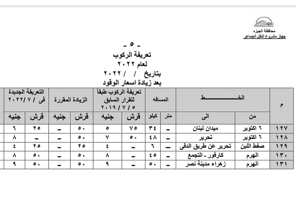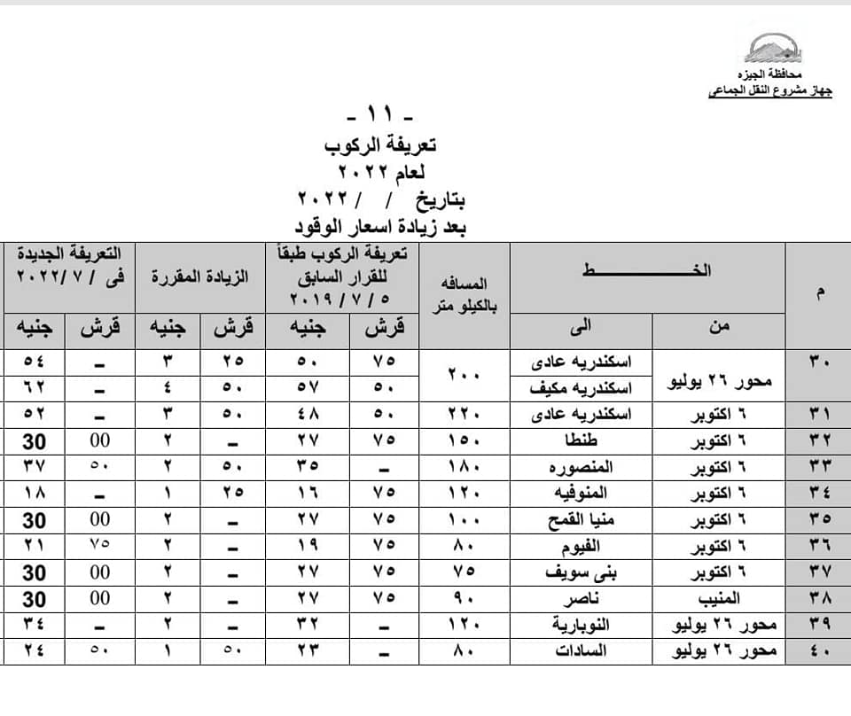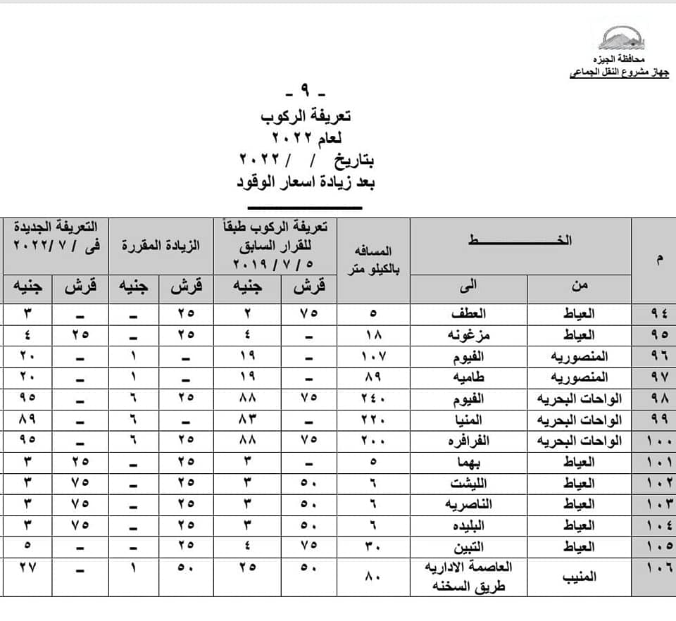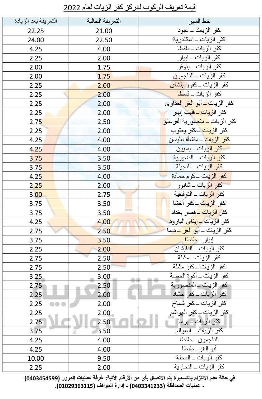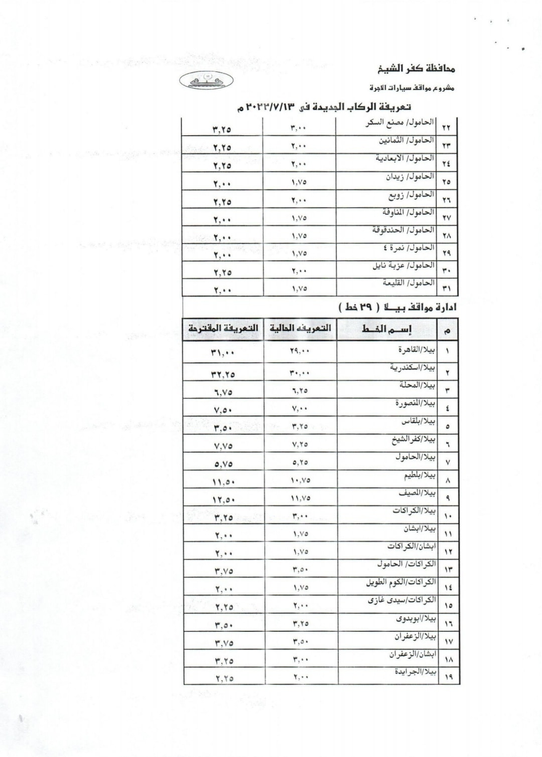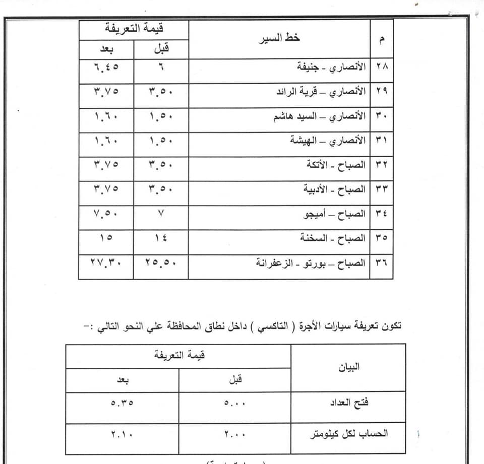 فى ضوء صدور قرار وزير البترول والثروة المعدنية بتعديل أسعار بعض المنتجات، قامت جميع محافظات الجمهورية بتعديل تعريفة ركوب السرفيس والنقل العام والأقاليم والتاكسى الأبيض، وننشر لكم تعريفة ركوب المواصلات العامة الجديدة، وسط حملات مكثفة على مواقف السيارات ومحطات الوقود لمتابعة التزام السائقين بالتعريفة الجديدة.