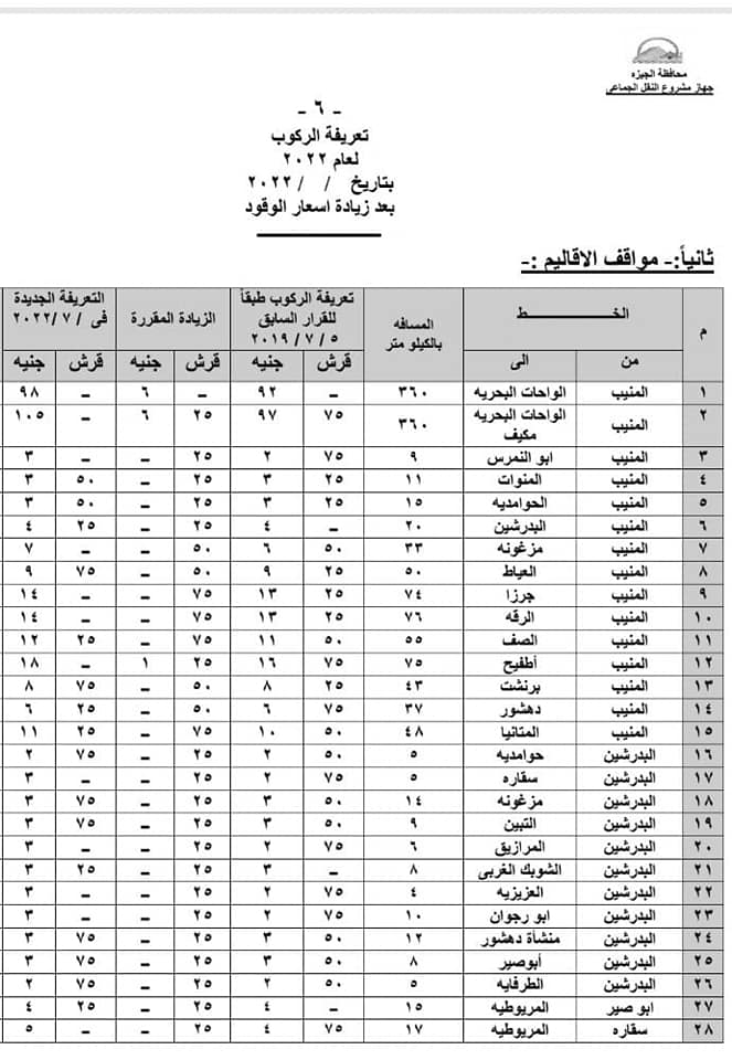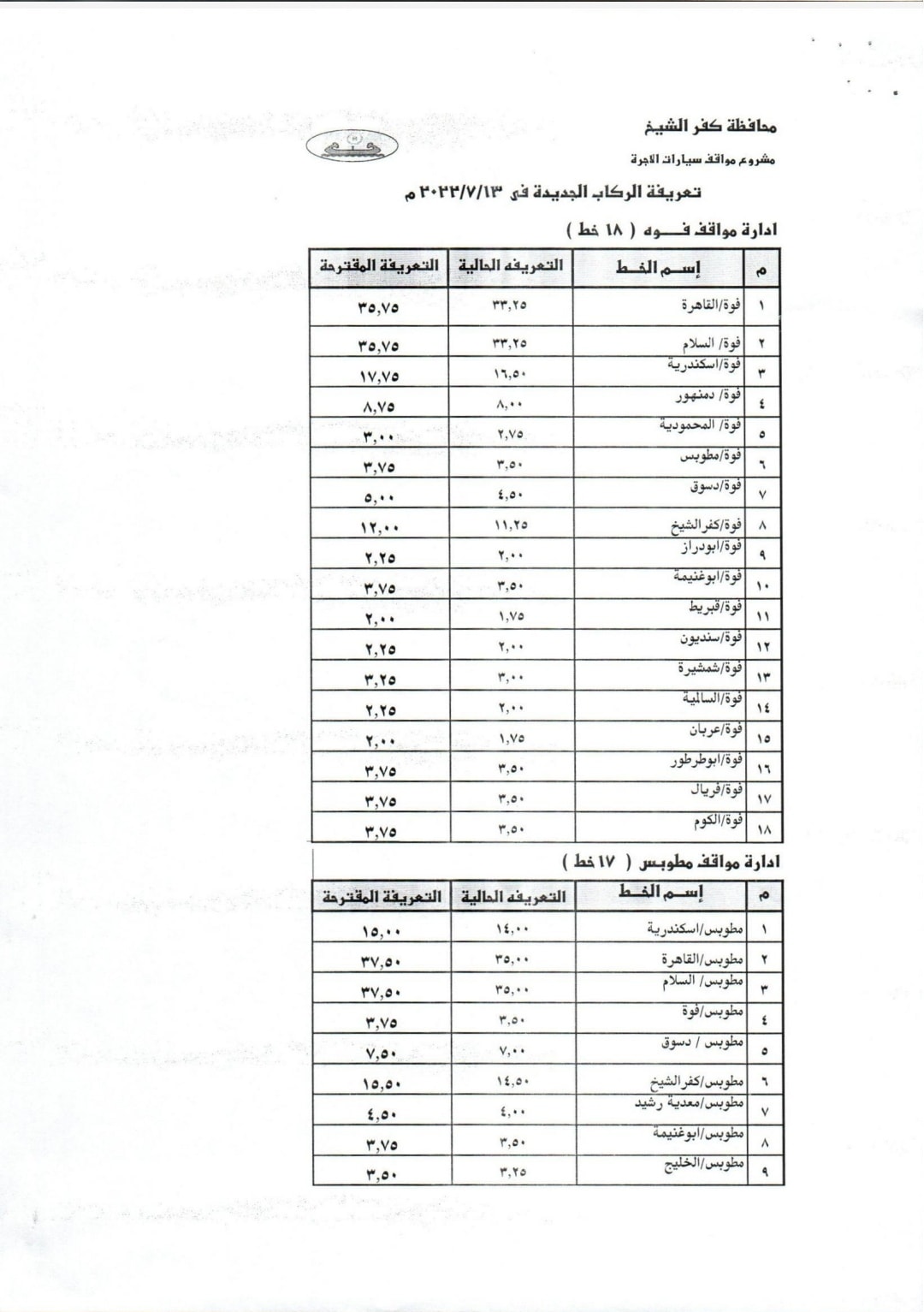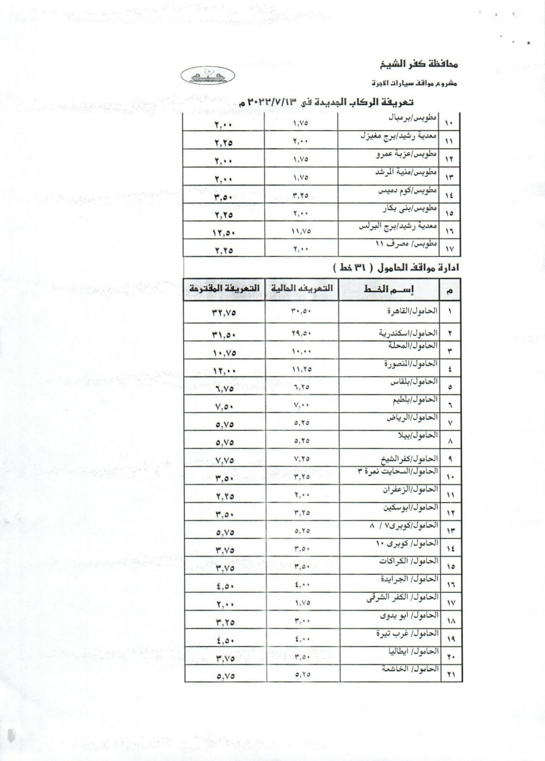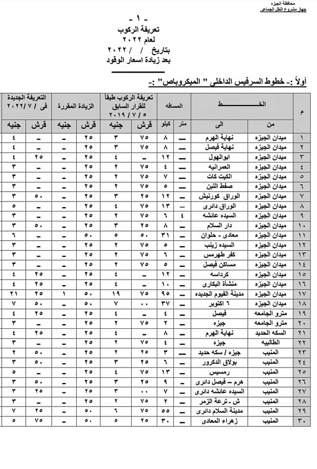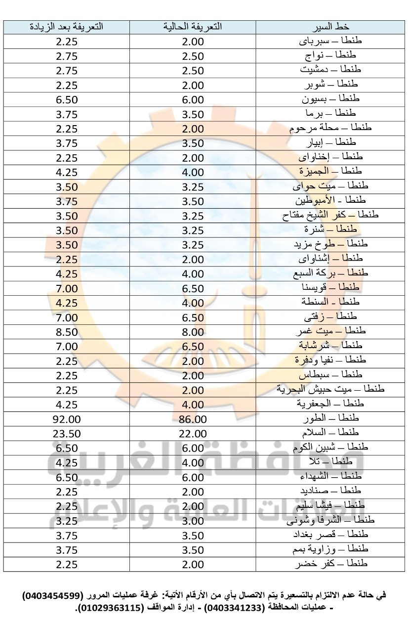 فى ضوء صدور قرار وزير البترول والثروة المعدنية بتعديل أسعار بعض المنتجات، قامت جميع محافظات الجمهورية بتعديل تعريفة ركوب السرفيس والنقل العام والأقاليم والتاكسى الأبيض، وننشر لكم تعريفة ركوب المواصلات العامة الجديدة، وسط حملات مكثفة على مواقف السيارات ومحطات الوقود لمتابعة التزام السائقين بالتعريفة الجديدة.