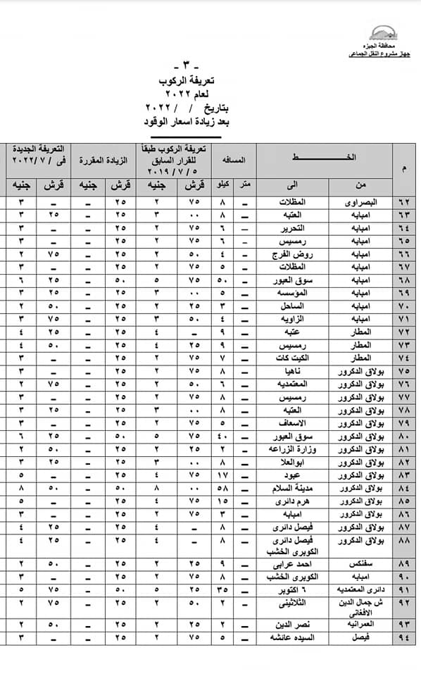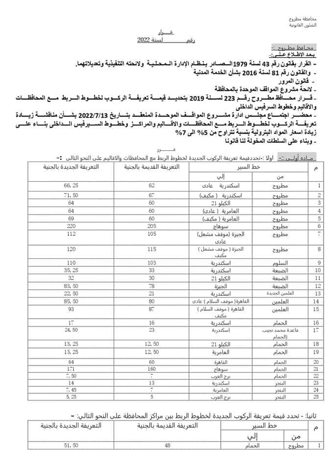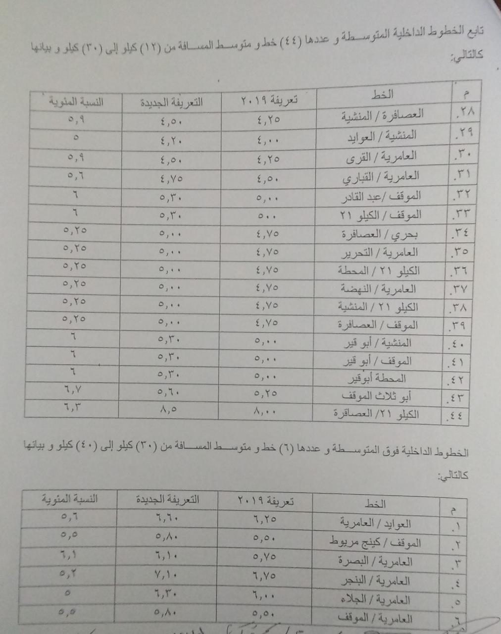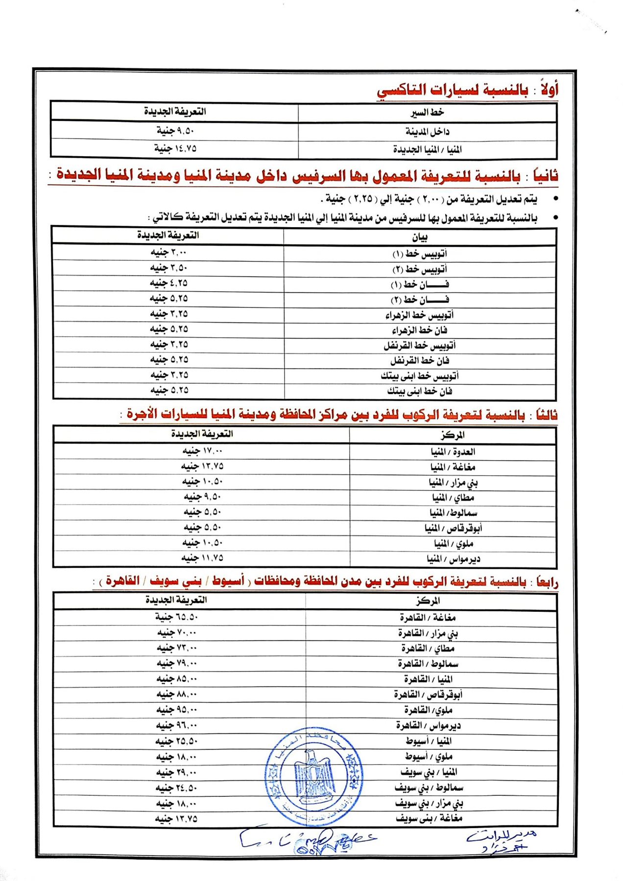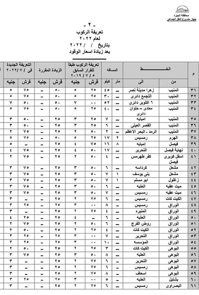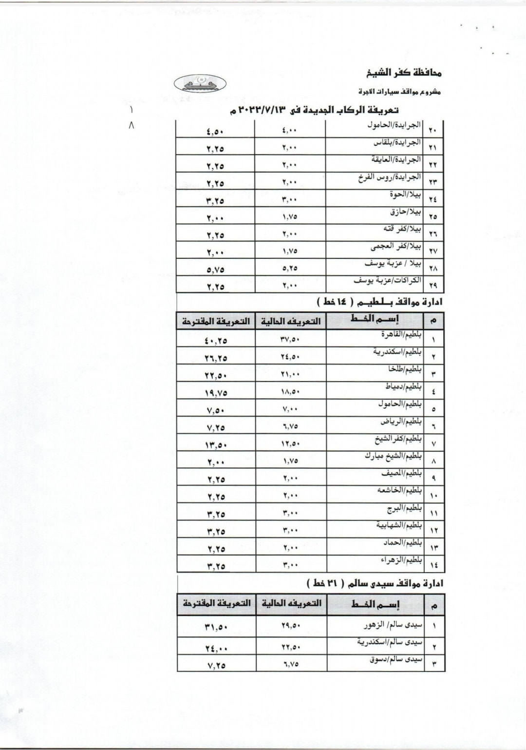 فى ضوء صدور قرار وزير البترول والثروة المعدنية بتعديل أسعار بعض المنتجات، قامت جميع محافظات الجمهورية بتعديل تعريفة ركوب السرفيس والنقل العام والأقاليم والتاكسى الأبيض، وننشر لكم تعريفة ركوب المواصلات العامة الجديدة، وسط حملات مكثفة على مواقف السيارات ومحطات الوقود لمتابعة التزام السائقين بالتعريفة الجديدة.