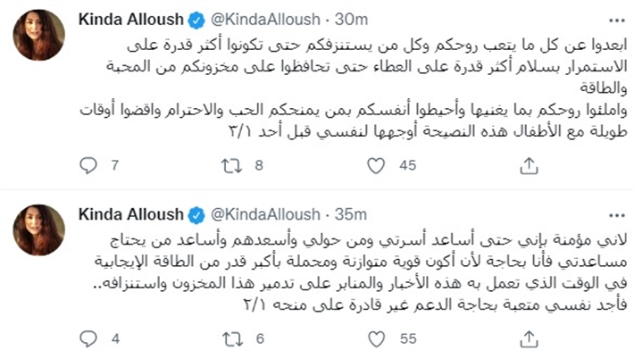 وتابعت كندة علوش: "أساعد من يحتاج مساعدة على قدر استطاعتي لإني مؤمنة بإني حتى أساعد أسرتي ومن حولي وأسعدهم وأساعد من يحتاج مساعدتي، فأنا بحاجة لأن أكون قوية متوازنة ومحملة بأكبر قدر من الطاقة الإيجابية، في الوقت الذي تعمل به هذه الأخبار والمنابر على تدمير هذا المخزون واستنزافه، فأجد نفسي متعبة بحاجة الدعم غير قادرة على منحه".