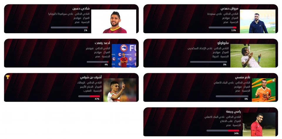 وشهدت القائمة استبعاد عمر السعيد ومحمد عبد الشافي ومحمد أشرف "روقا" ومحمد أبو جبل وطارق حامد ويوسف أسامة نبيه وسيف فاروق جعفر.