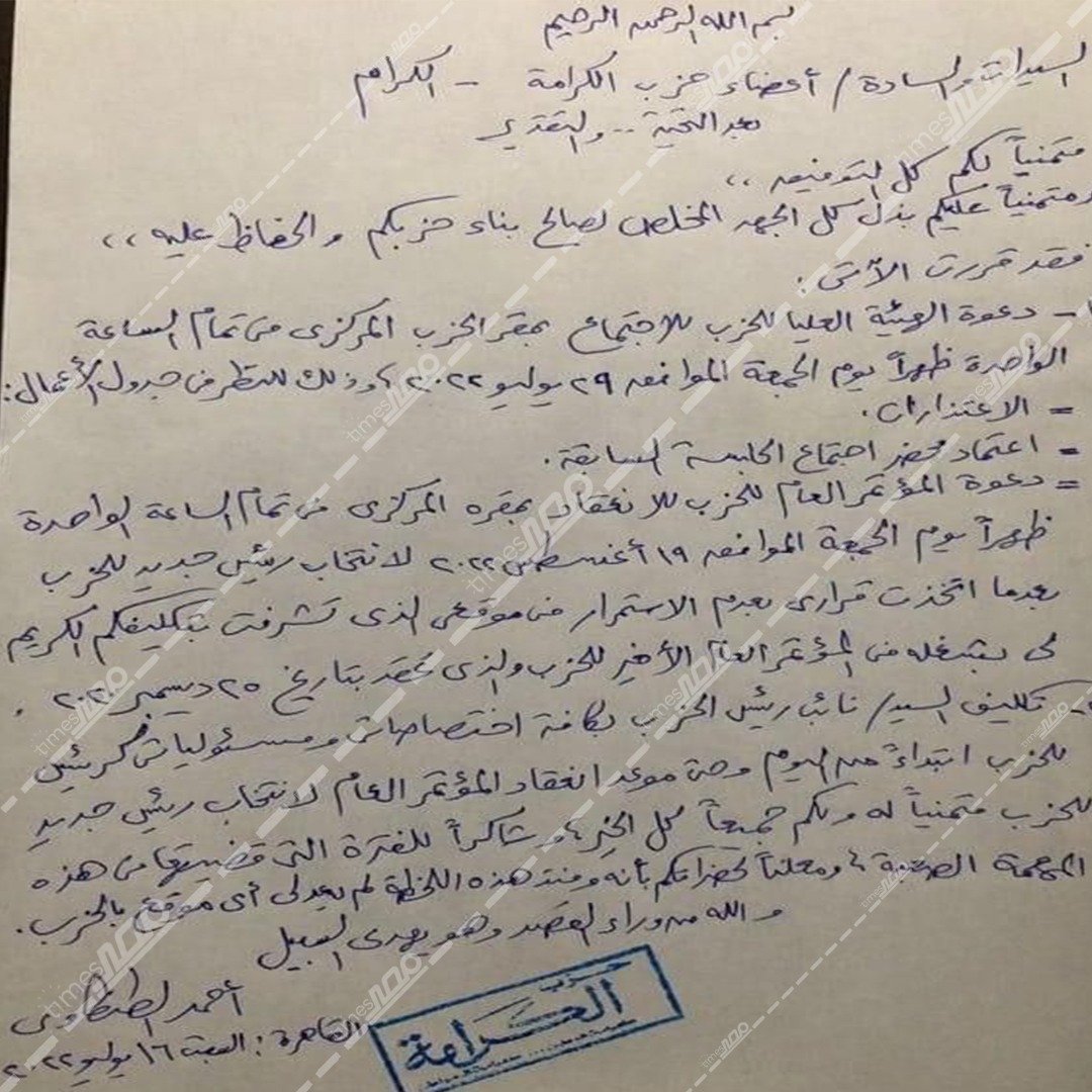 وحصل “مصر تايمز” على خطاب نص استقالة أحمد الطنطاوي الذي أشار فيه إلى اجتماع أعضاء المؤتمر العام للحزب يوم الجمعة نهاية الشهر الجاري يوليو، على أن يتم انتخاب الرئيس الجديد للخزب يوم 19 أغسطس المقبل.