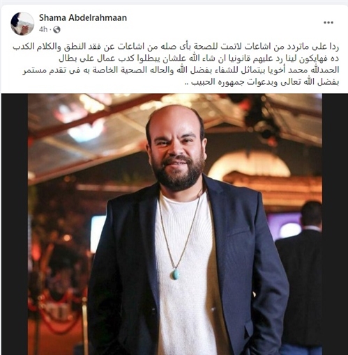 كتبت شقيقة محمد عبد الرحمن عبر حسابها الرسمي بموقع التواصل الاجتماعي “فيس بوك” :"ردا على ما تردد من شائعات لا تمت للصحة بأى صلة؛ من شائعات عن فقد النطق والكلام، الكدب ده فهايكون لينا رد عليهم قانونيا، إن شاء الله علشان يبطلوا كدب عمال على بطال".