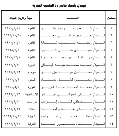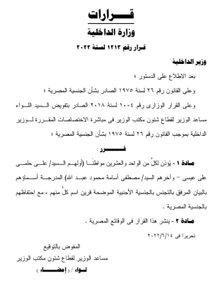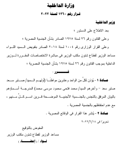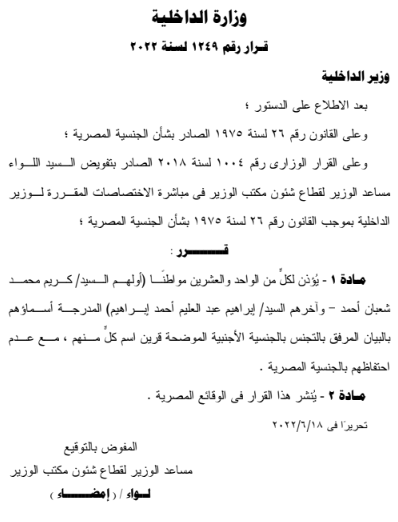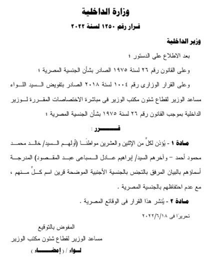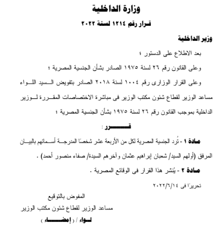 وصدر القرار بعد الاطلاع على القانون رقم 26 لسنة 1975 الصادر بشأن الجنسية المصرية، كما نشرت الجريدة قرار برد الجنسية المصرية لـ 14 شخص.