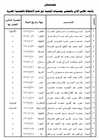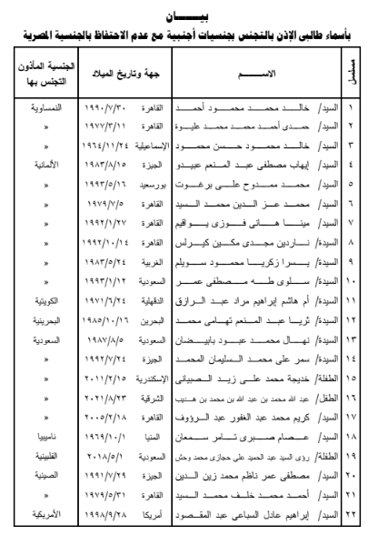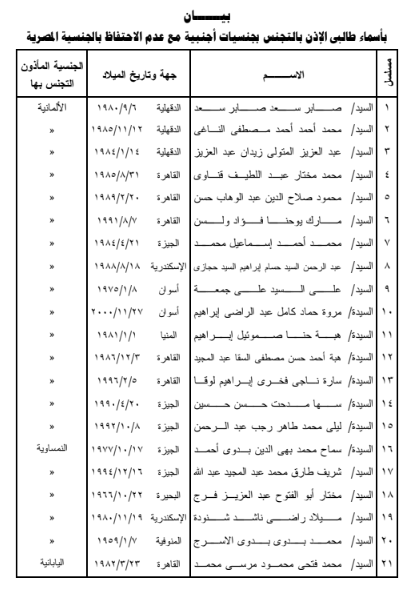 نشرت الجريدة الرسمية اليوم الإثنين، قرار وزارة الداخلية بالإذن لـ 104 أشخاص بالتجنس بالجنسية الأجنبية المرفقة، مقابل كل اسم في الكشوف التالية:
