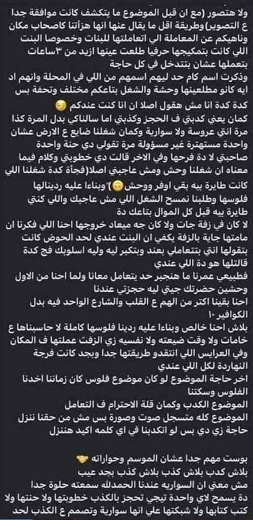 وأضافت، السكرتيرة بلغتنا كأصحاب مكان وكان ردنا مفيش أي مشكلة العروسة هتستنى معانا نص ساعة بالظبط هنظبطلها حاجات في الميك أب والطرحة والفينش النهائي عشان دي مش سواريه دي عروسة في الأول والآخر ده في وشنا، وبناء عليه هيبقى في فرق بسيط في الحساب ولو كان من الأول موضوع مقدرتها ولا لا، الموضوع كان هيختلف احنا الحمدلله بنعمل لله كتير في شغلنا، المهم اتفاجئنا بطريقة مش لطيفة من العروسة وقالت أنا لا هغير حاجة ولا هتصور، مع إن قبل الموضوع ما يتكشف كانت موافقة جداً على التصوير وطريقة أقل ما يقال عنها إنها لا تليق بينا كأصحاب مكان.