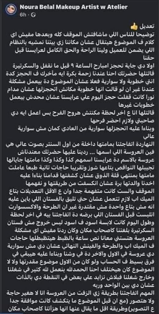 وأضافت “أنا على آخر لحظة مكنتش هروح الفرح، بس أعمل إيه دي صاحبتي ولازم أحضر فرحها، وبناء عليه اتحجزلها سواريه من العادي كمان مش سواريه عالي، اتفاجئنا بمامتها داخلة من أول السنتر بصوت عالي هي فين العروسة اللي اسمها كذا، ردينا عليها حضرتك معندناش عروسة بالاسم ده، طبعا عاملت مامتها بمنتهى قلة الذوق عشان كشفتها قدامنا، وبناء عليه أخدنا والدتها برة عشان اتكسفت من طريقتها ونفهمها الموقف والست كانت متفهمة جدًا، وإن على الأقل التعديلات بتاعت الميك أب لازم تليق عشان تتعمل، حتى تليق على الفستان اللي باين عليه إنه مش بتاع واحدة مش مقتدرة، غير إن الطرحة والاكسسورات اتلبست قبل الفستان اللي برضه اتفاجئنا بيه في آخر لحظة وطول اليوم كانت لابسة أسود لبس خروج مش فستان”.
