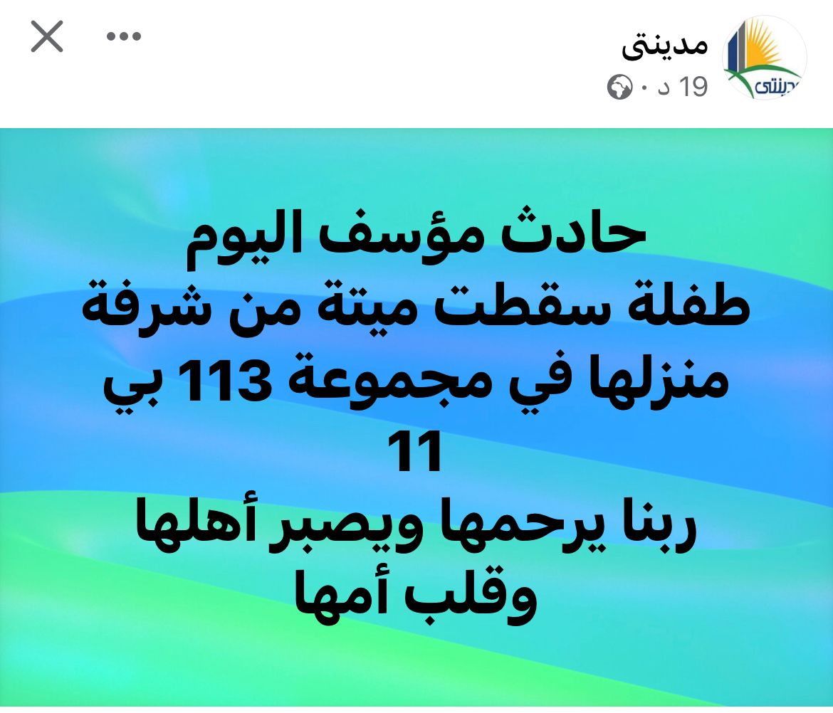 ونشرت صفحة "مدينتى" على موقع التواصل الاجتماعي "فيس بوك" منشور يفيد بسقوط طفلة من شرفة منزلها في مجموعة 113 B 11 مطالبين بالدعاء للطفلة بالرحمة والصبر لأسرتها.