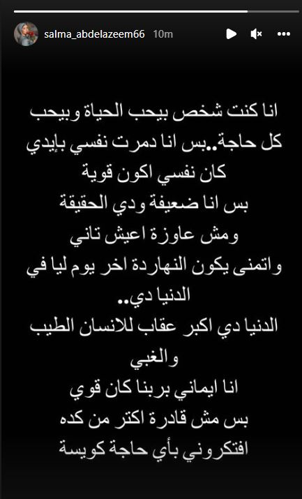 تابعت سلمى عبد العظيم : “مش عايزة أعيش تاني وأتمنى يكون النهاردة آخر يوم ليا في الدنيا دي ..الدنيا دي أكبر عقاب للطيب والغبي.. أنا ايماني بربنا كان قوي بس مش قادرة أكتر من كده افتكروني بأي حاجة كويسة”.