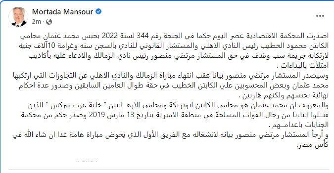 أعلن مرتضى منصور رئيس نادي الزمالك أن المحكمة الاقتصادية أصدرت اليوم الأربعاء حكماً في الجنحة رقم 344 لسنة 2022 بحبس محمد عثمان محامي الكابتن محمود الخطيب رئيس النادي الاهلي والمستشار القانوني للنادي بالسجن سنه وغرامة 10آلاف جنية لارتكابه جريمة سب وقذف في حق المستشار مرتضي منصور رئيس نادي الزمالك والادعاء عليه بأكاذيب امتلأت بالبذاءات .